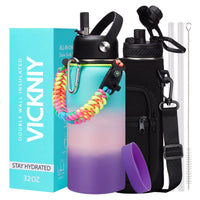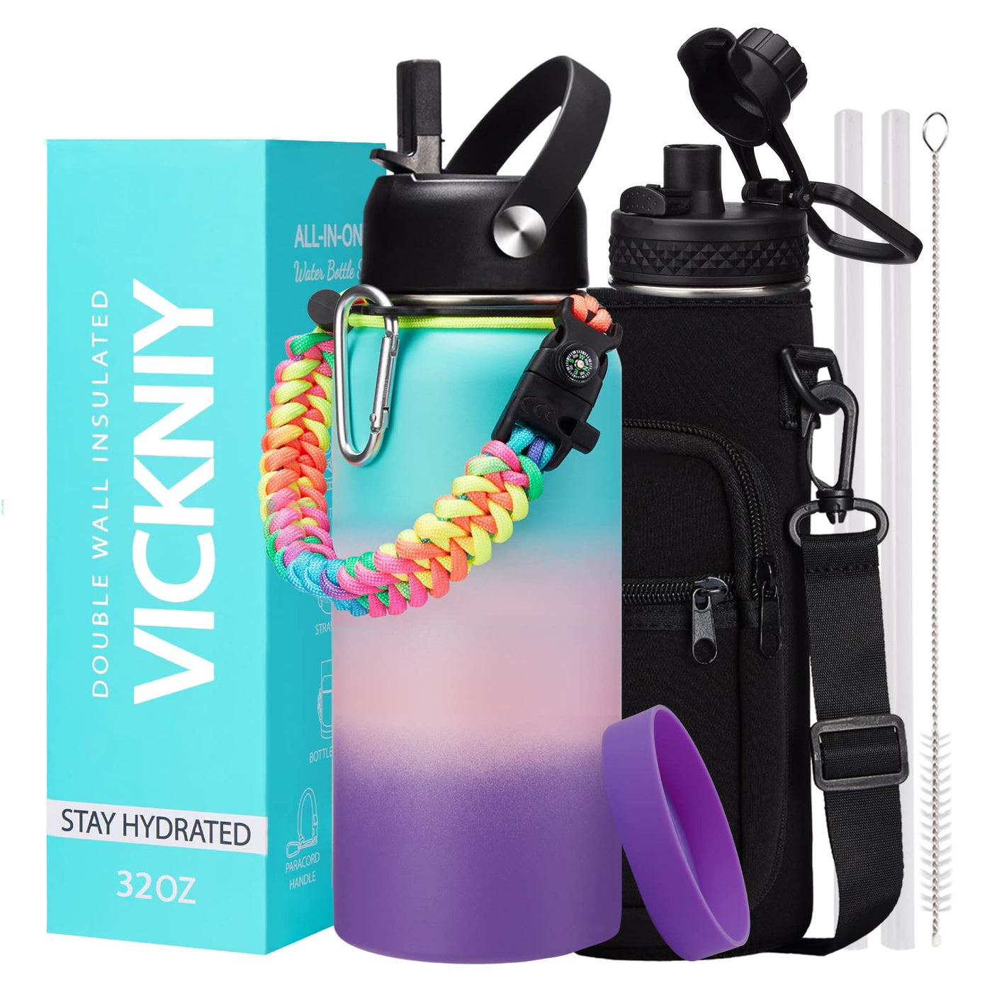 - Q: What accessories are included with the VICKNIY Flask Water Bottle? A: The purchase includes a straw lid, auto chug lid, paracord handle, BPA-free straws, a carrier bag, shoulder strap, silicone boot, and a straw brush.