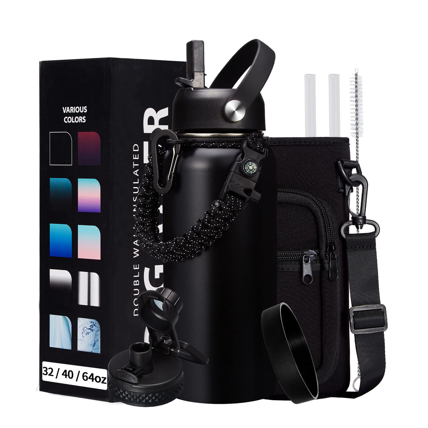 32-40-64OZ Stainless Steel Water Bottle - Black Water Bottle with Straw & Spout Lid Paracord Handle & Bottle Sleeve Insulated Vacuum Water Flask Double-Wall Metal Thermo Cup Canteen for Gym School