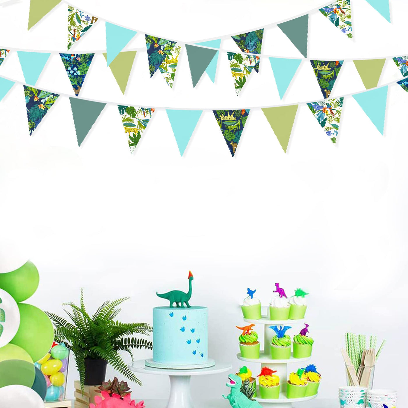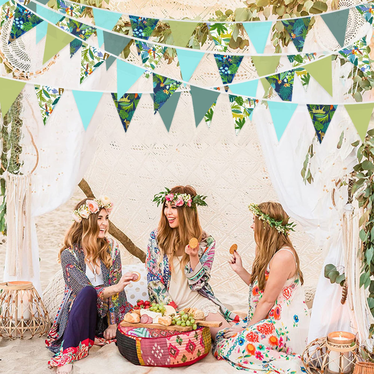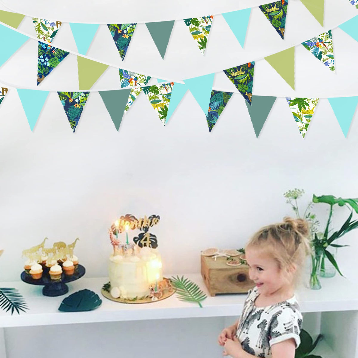 32Ft Teal Blue Green Summer Tropical Leaves Wild Animals Printed Pennant Banner Fabric Triangle Flag Cotton Bunting Garland For