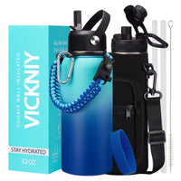 - Q: What is the capacity of the VICKNIY insulated water bottles? A: The VICKNIY insulated water bottles come in three sizes: 32 ounces, 40 ounces, and 64 ounces.