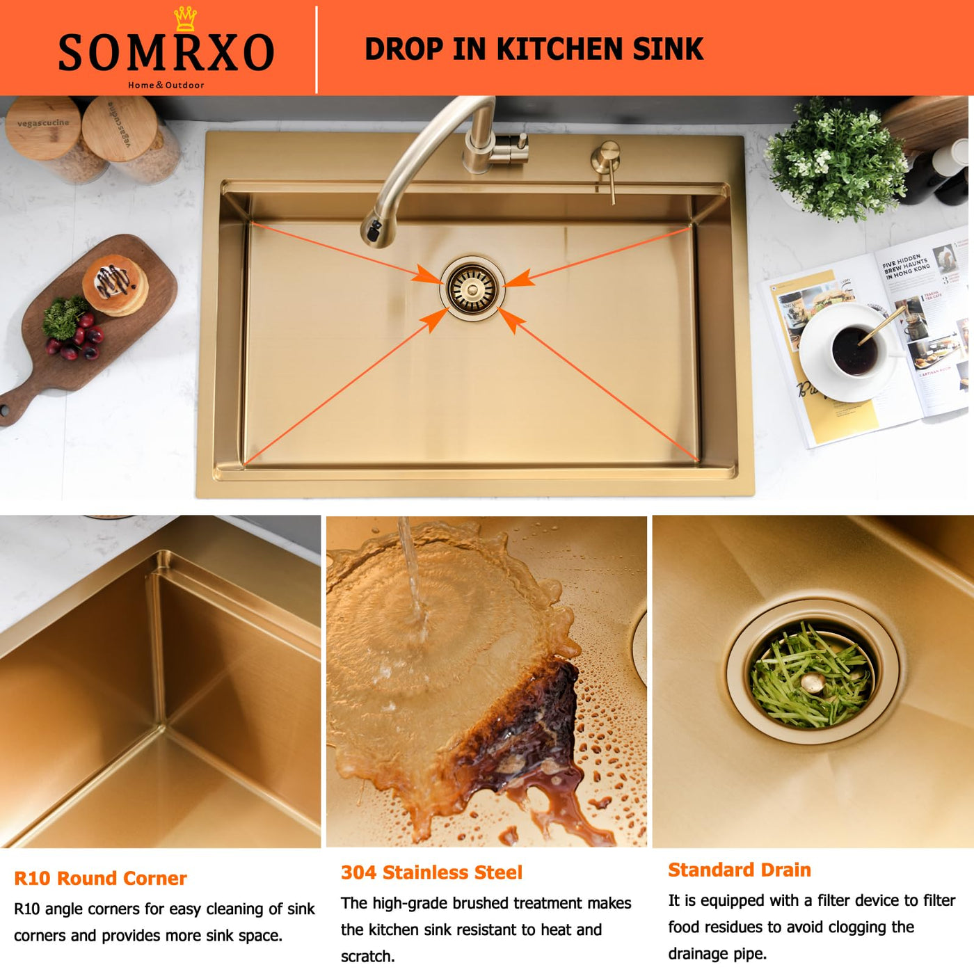 • Q: What are the dimensions of the SOMRXO Gold Drop In Kitchen Sink? A: The SOMRXO Gold Drop In Kitchen Sink measures 33 inches in length, 22 inches in width, and has a depth of 10 inches.