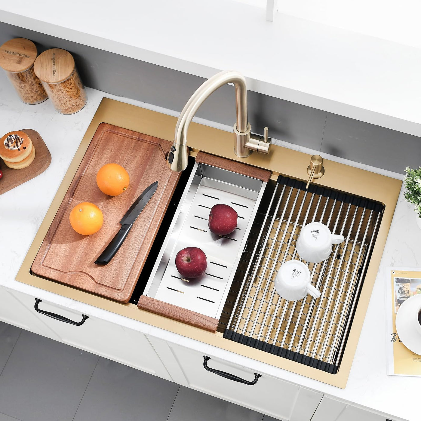 33 Inch Gold Kitchen Sink Drop In Workstation-Somrxo 33 22 Drop In Kitchen Sink Gold Workstation Sink 16 Gauge Gold Stainlesss