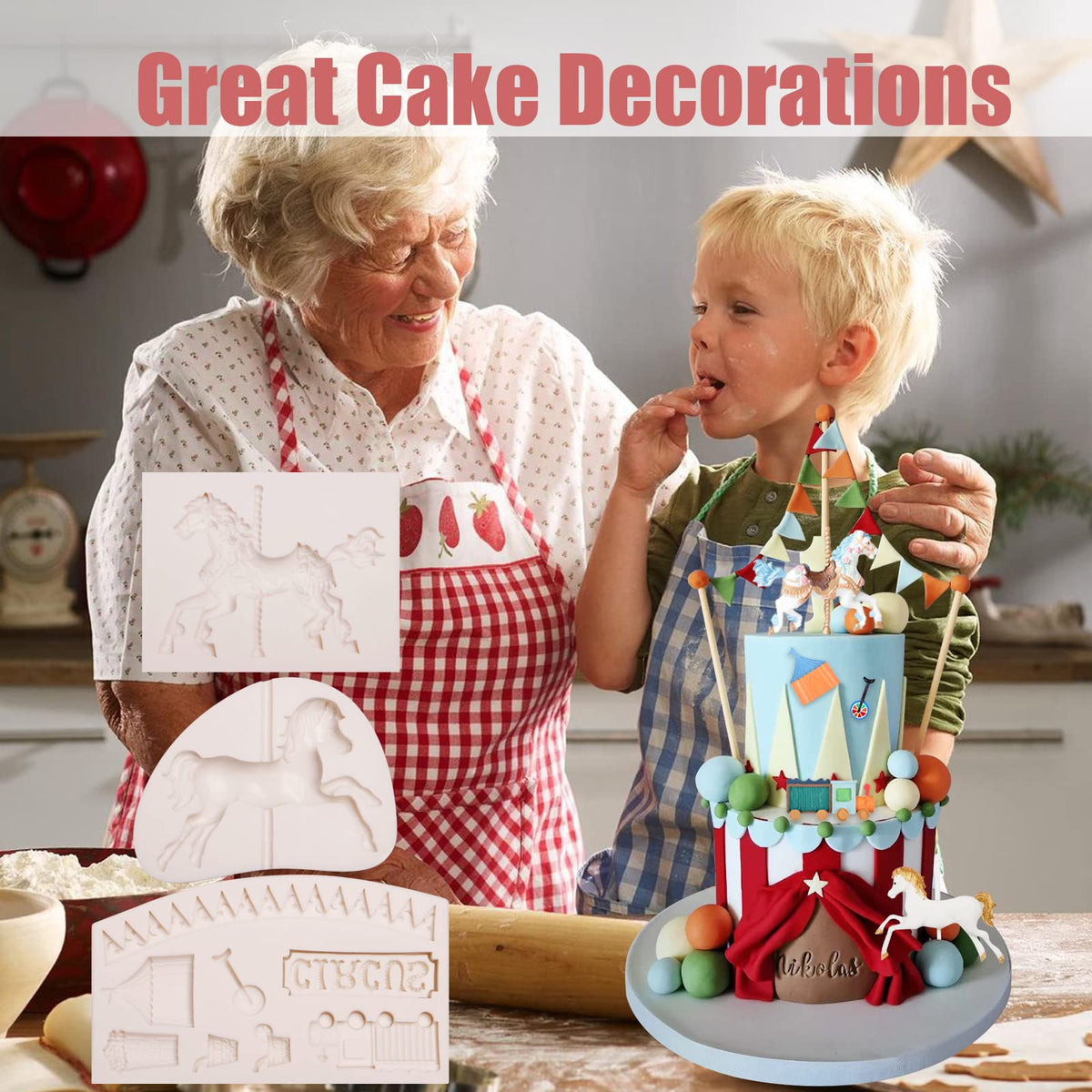 3D Carousel Horse Silicone Molds 3 Pcs, Circus Fondant Mold For Cake Decoration, Candy Sugar Cupcake Topper Cake Pop Popsicle, B