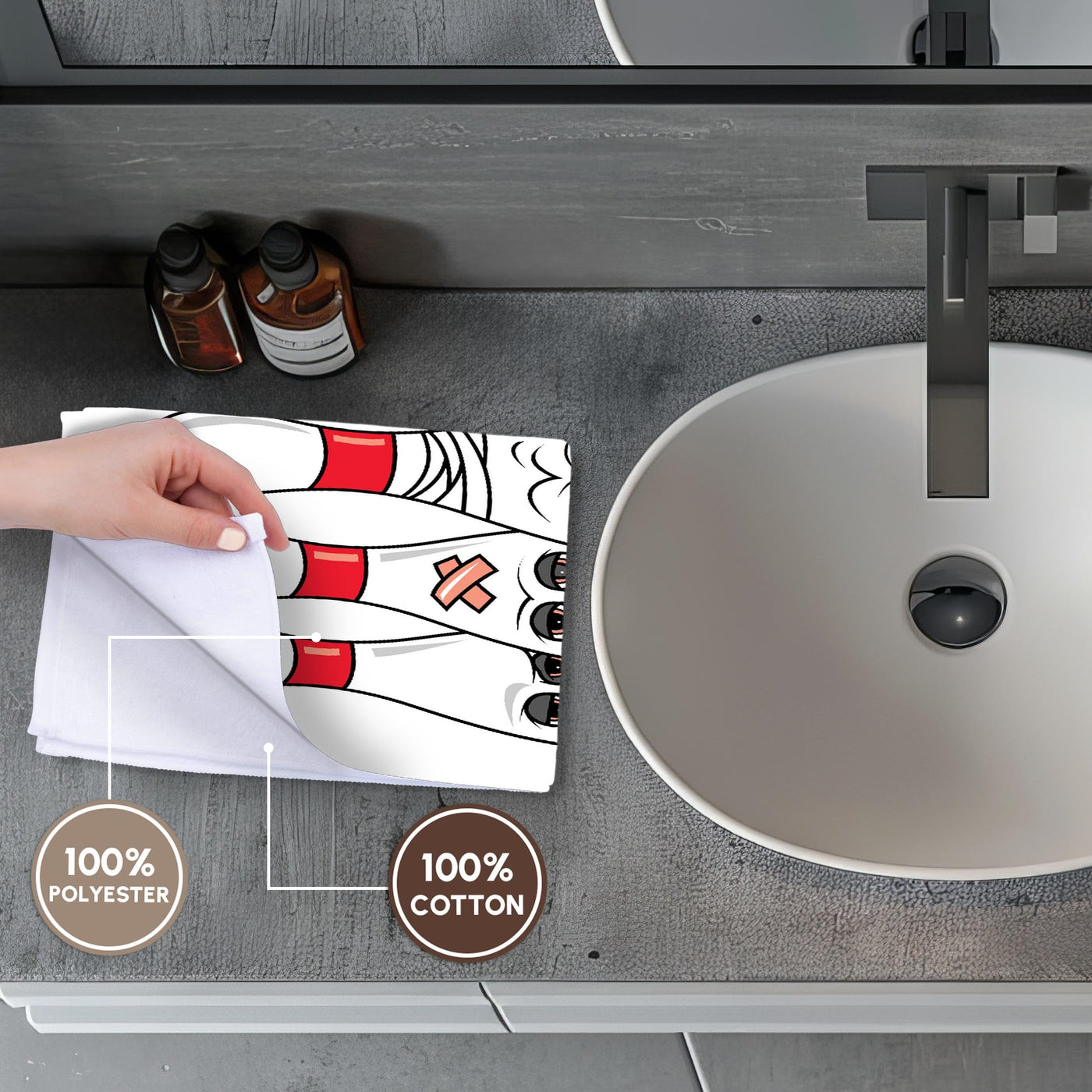 • Q: What is the design of the towel? A: The towel features a funny cartoon design of busted up injured bowling pins.