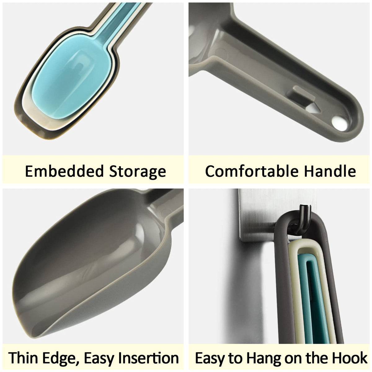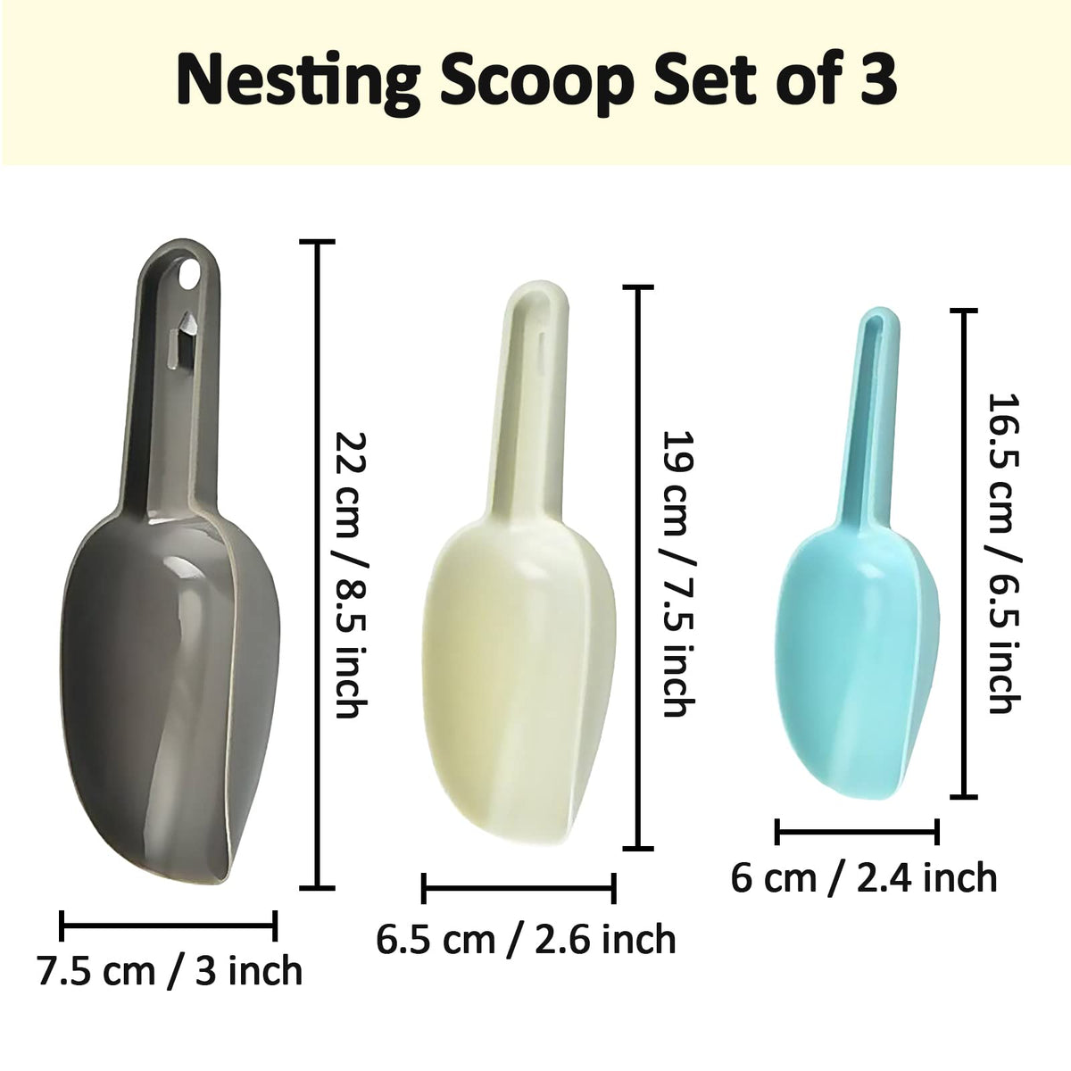 • Q: How much storage space do the scoops save? A: The 3-in-1 design allows the scoops to nest inside each other, saving up to 60% of storage space.