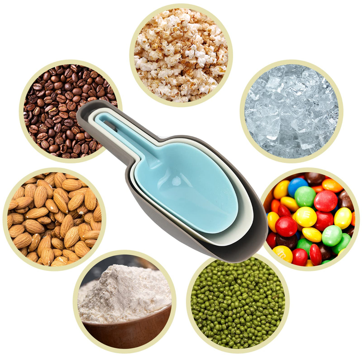 • Q: Can these scoops be used for pet food? A: Yes, these scoops are multi-purpose and can be used for pet food, as well as dry foods like rice, flour, and even ice cubes.