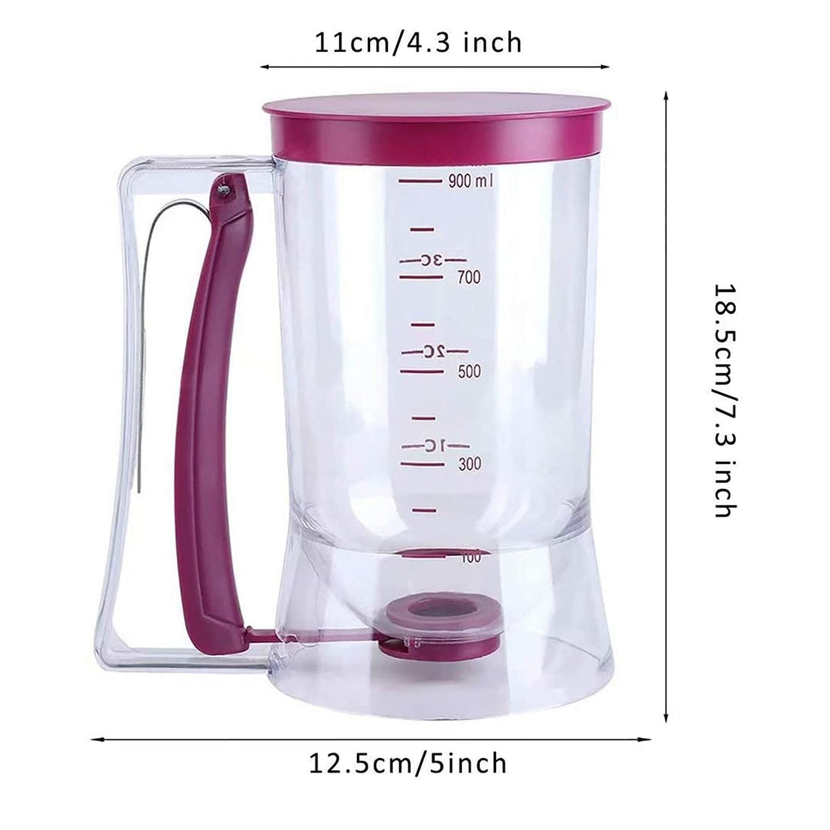 • Q: What is the capacity of the Pancake & Cupcake Batter Dispenser? A: The Pancake & Cupcake Batter Dispenser has a capacity of 900mL, allowing you to easily measure and dispense batter for pancakes, cupcakes, crepes, and other baked goods.