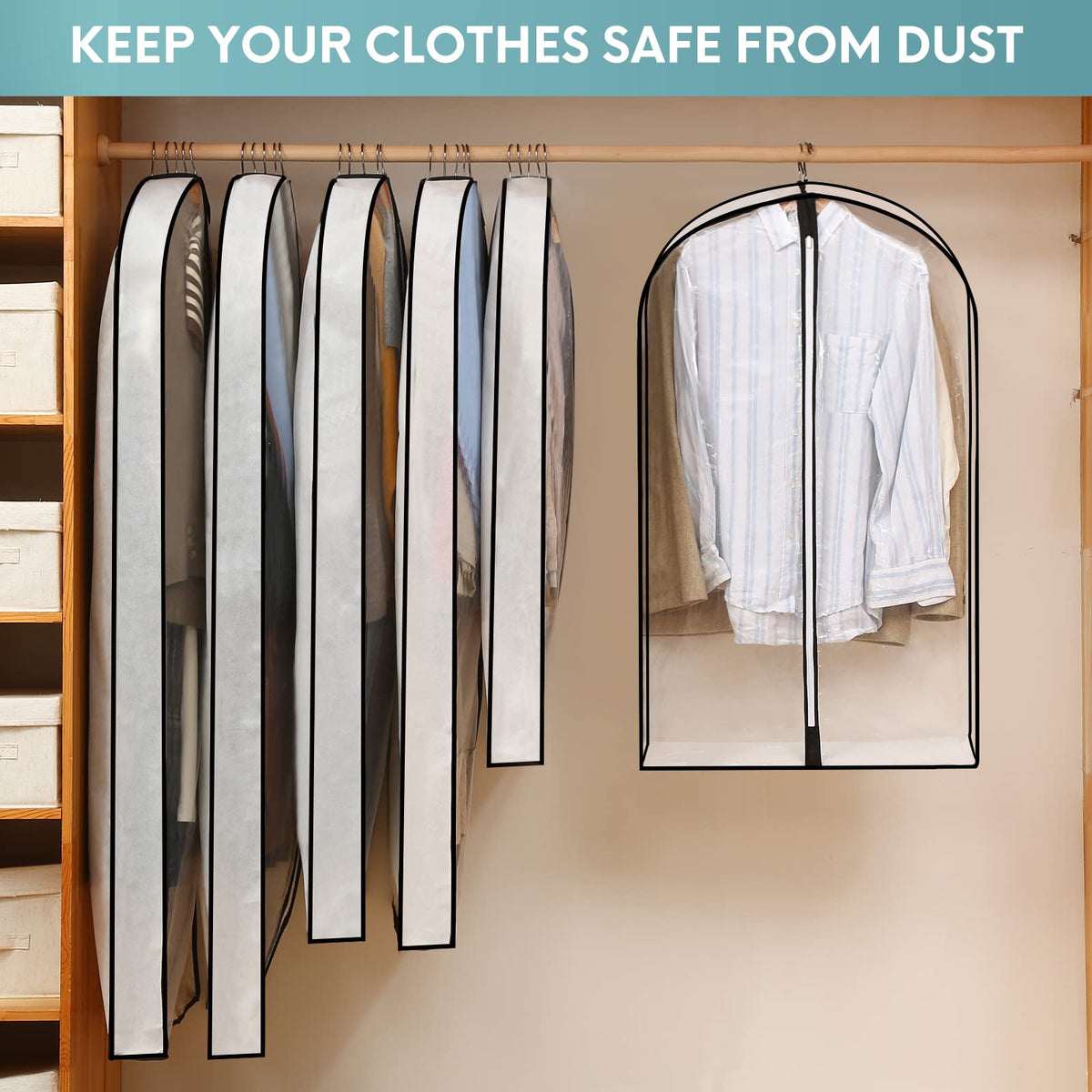 - Q: Can I hang these garment bags in my closet? A: Yes, the bags come with a small hanging hole at the top, designed for convenient hanging in closets while preventing dust accumulation.