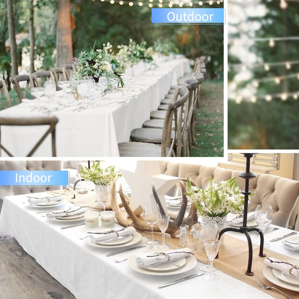 • Q: Can this tablecloth be used for outdoor events? A: Yes, the tablecloth is suitable for both indoor and outdoor events, including weddings, banquets, and parties.