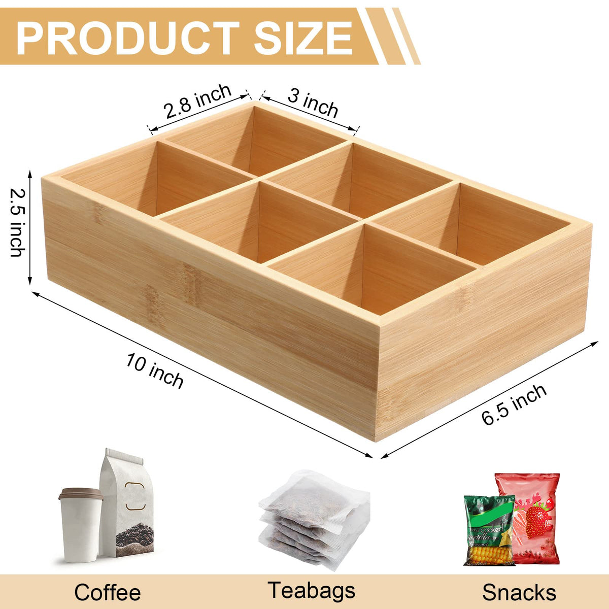 • Q: How many compartments does each organizer have? A: Each bamboo divided storage bin features 6 compartments, with each compartment measuring about 3 x 2.8 x 2.5 inches.