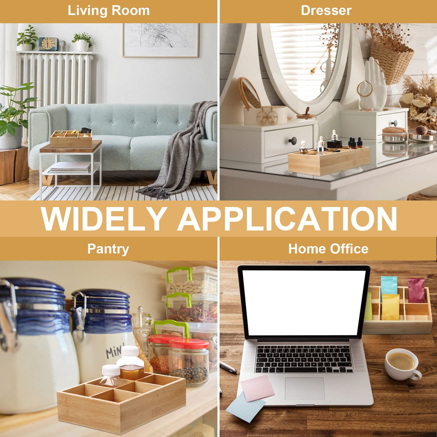 • Q: How can these organizers help with kitchen clutter? A: The bamboo pantry bins help organize and separate items, making it easier to keep your kitchen space tidy and clutter-free.