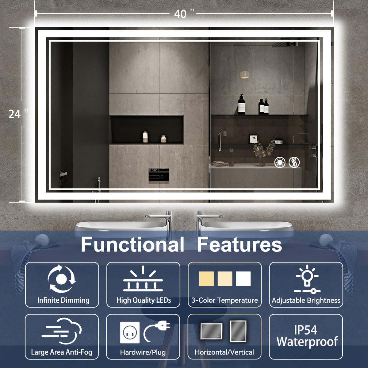 40 X 24 Led Bathroom Mirror Bathroom Mirror With Lights Front And Backlit Cri 90+ Led Mirror For Bathroom Anti-Fog Dimmable 3