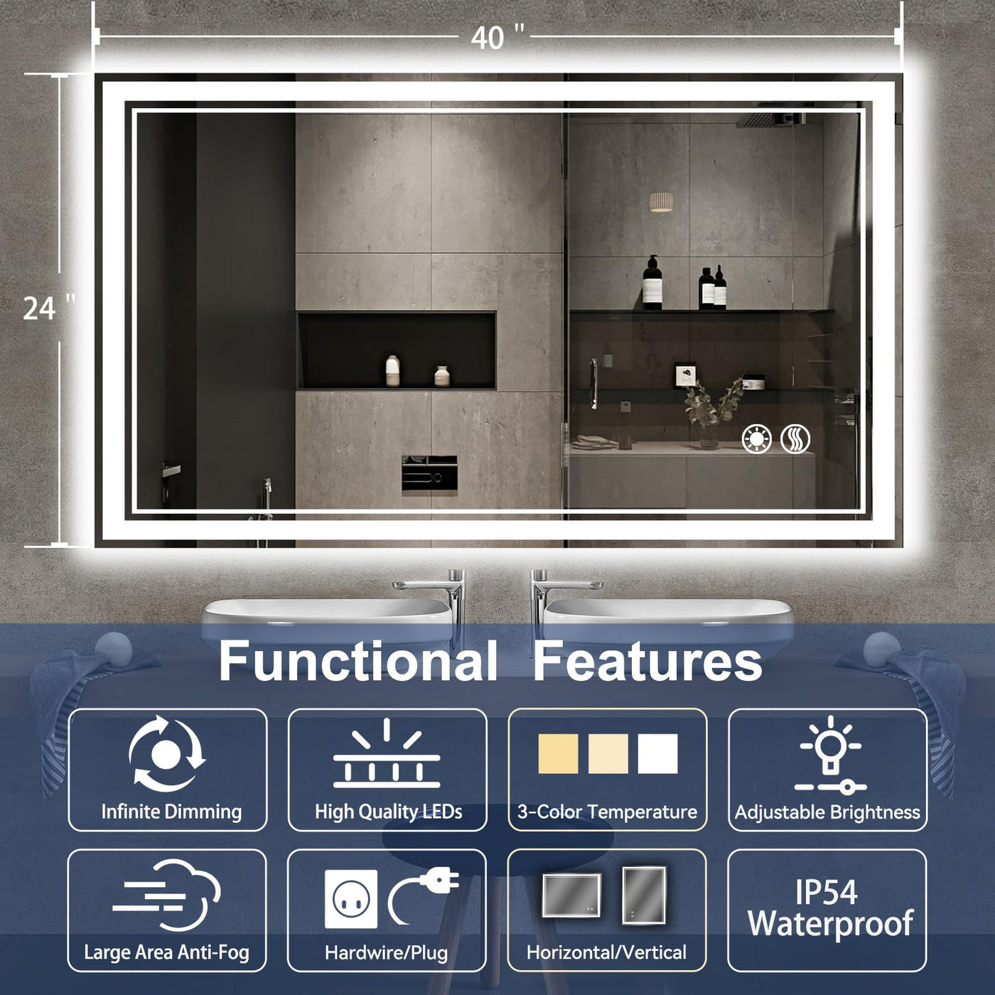• Q: What are the dimensions of the LED bathroom mirror? A: The dimensions of the LED bathroom mirror are 40 inches by 24 inches.