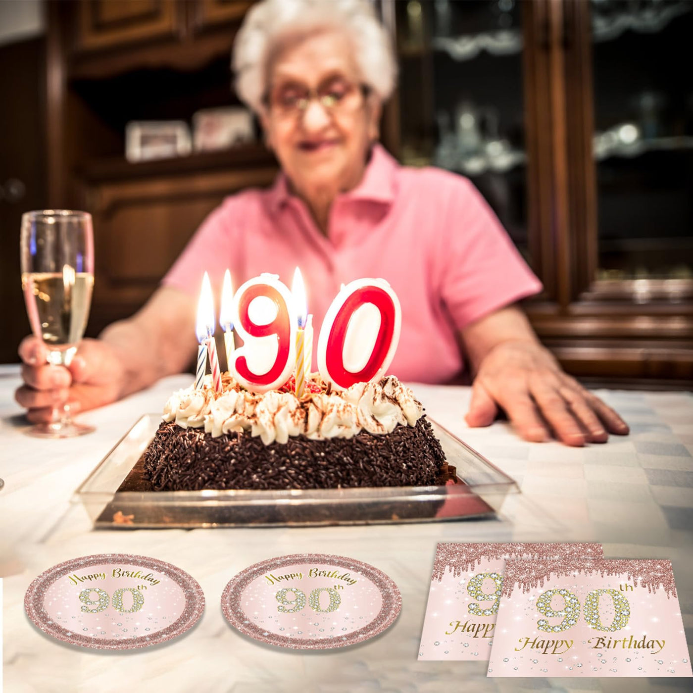 - Q: What is the design feature of the plates and napkins? A: The plates and napkins feature an eye-catching design with large '90' fonts and happy birthday text, surrounded by a dazzling diamond pattern, adding elegance to your party.