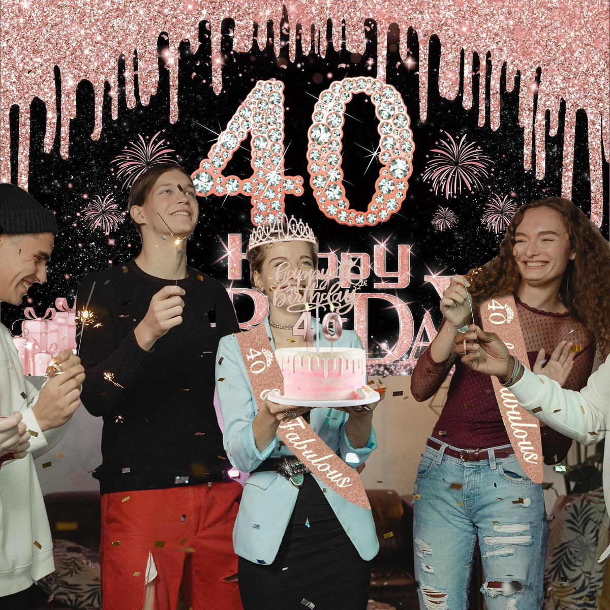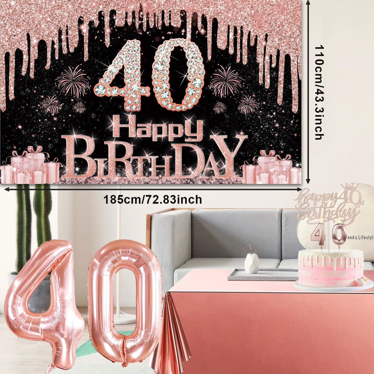 - Q: What items are included in the 40th Birthday Decorations pack? A: The pack includes a 40th Birthday Banner, Tiara, Sash, Happy 40th Birthday Cake Topper, Birthday Candles, Balloons, and a Rose Gold Tablecloth.