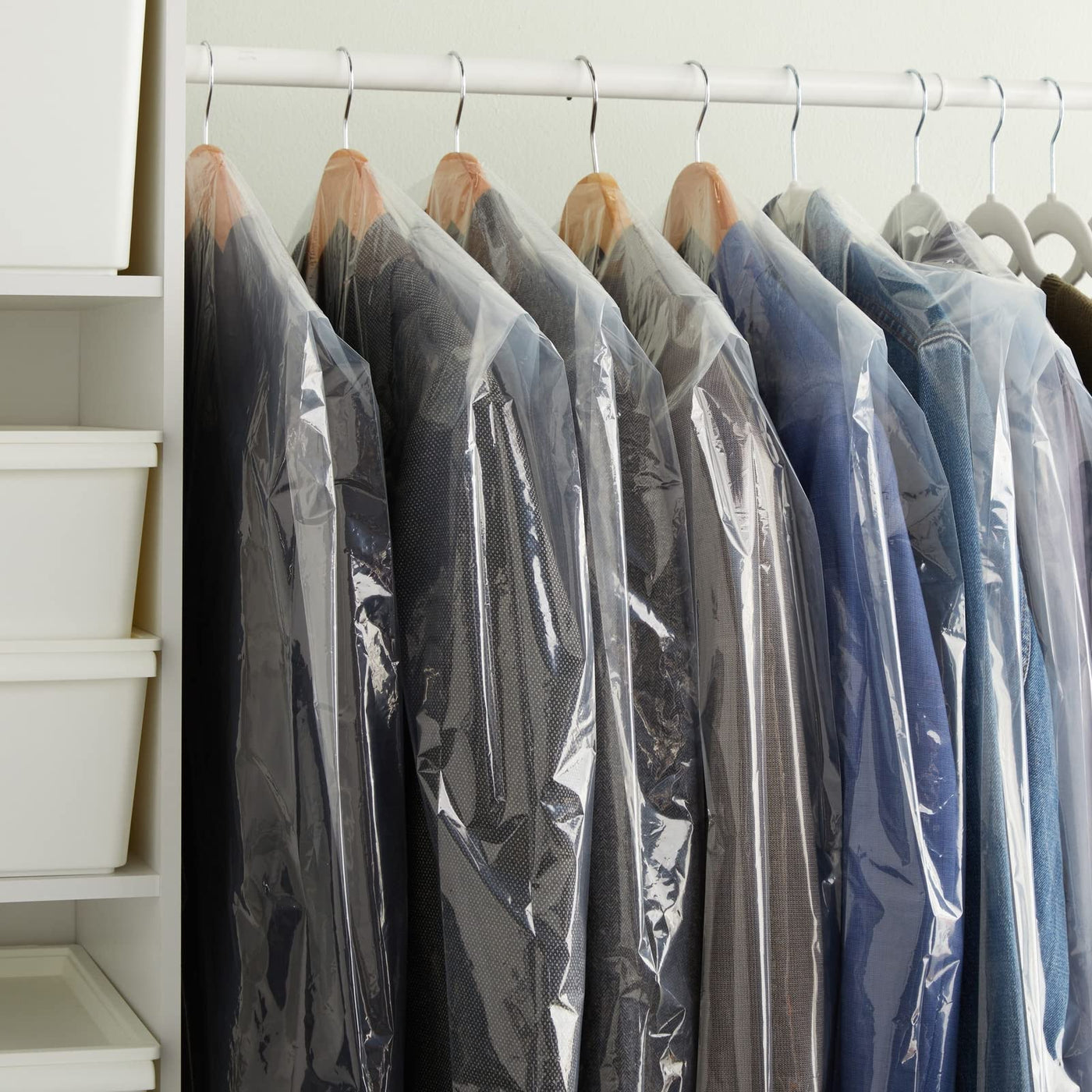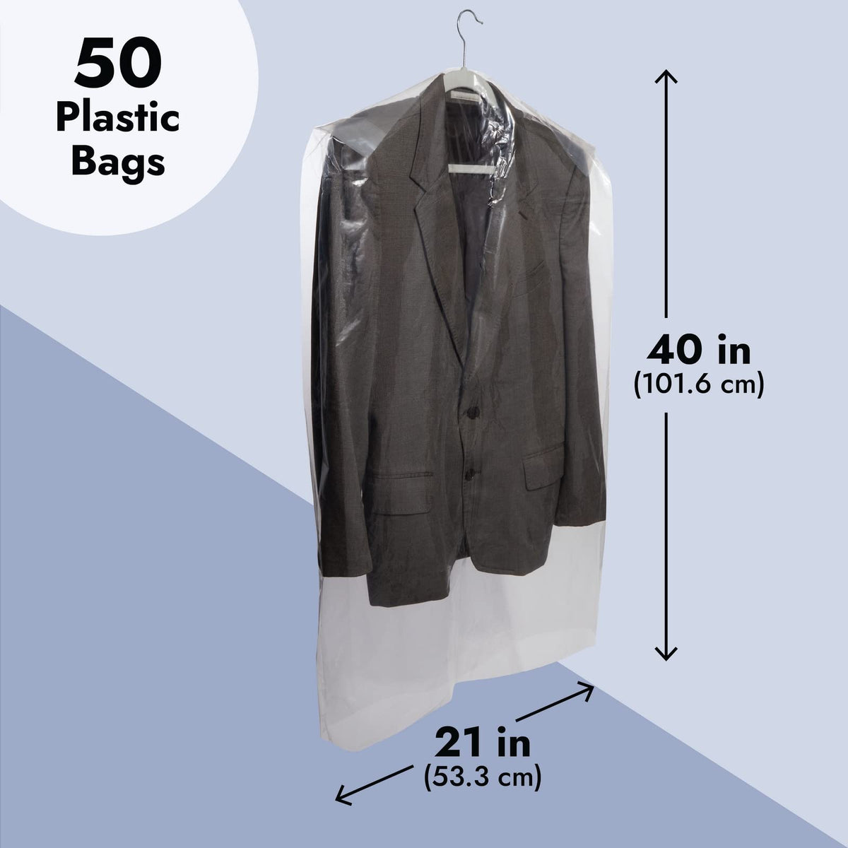 - Q: How many garment bags come in a pack? A: This product includes a pack of 50 clear plastic garment bags.