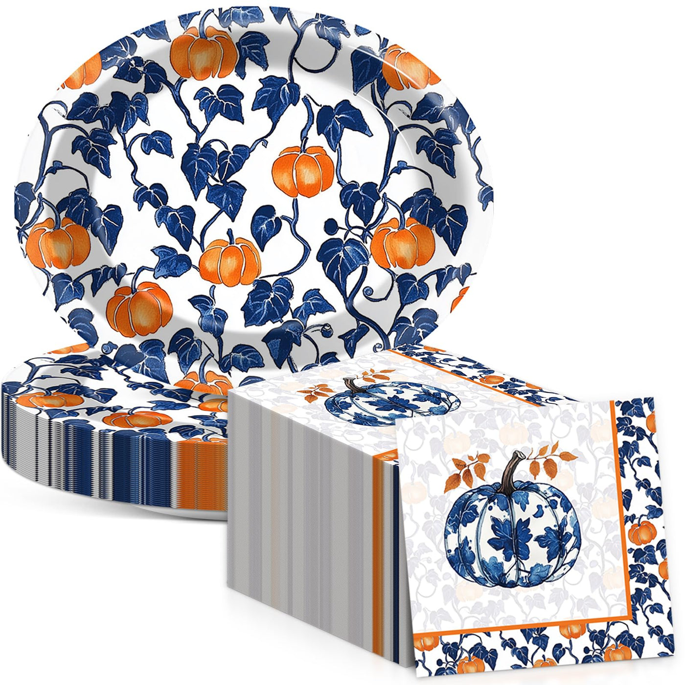 50 Pcs Blue Pumpkin Fall Oval Paper Plates 11inch Autumn Floral Leaves Plates and Napkins Thanksgiving Oval Disposable Dinnerwar