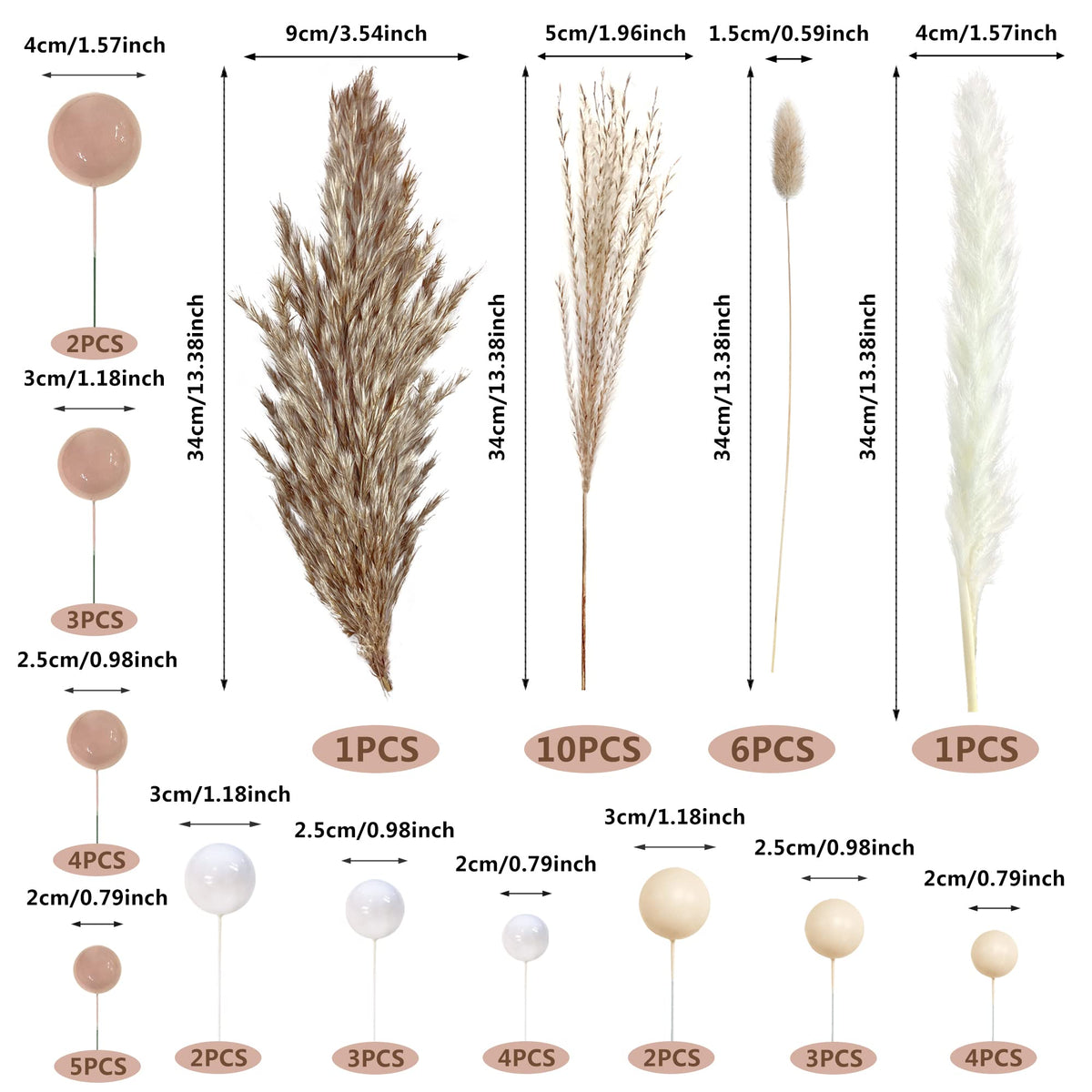 - Q: How many pieces are included in the package? A: The package contains a total of 50 pieces, which includes 32 mini ball cake toppers, 1 white pampas grass, 1 brown pampas grass, 6 bunny tails pampas grass, and 10 reed grass.