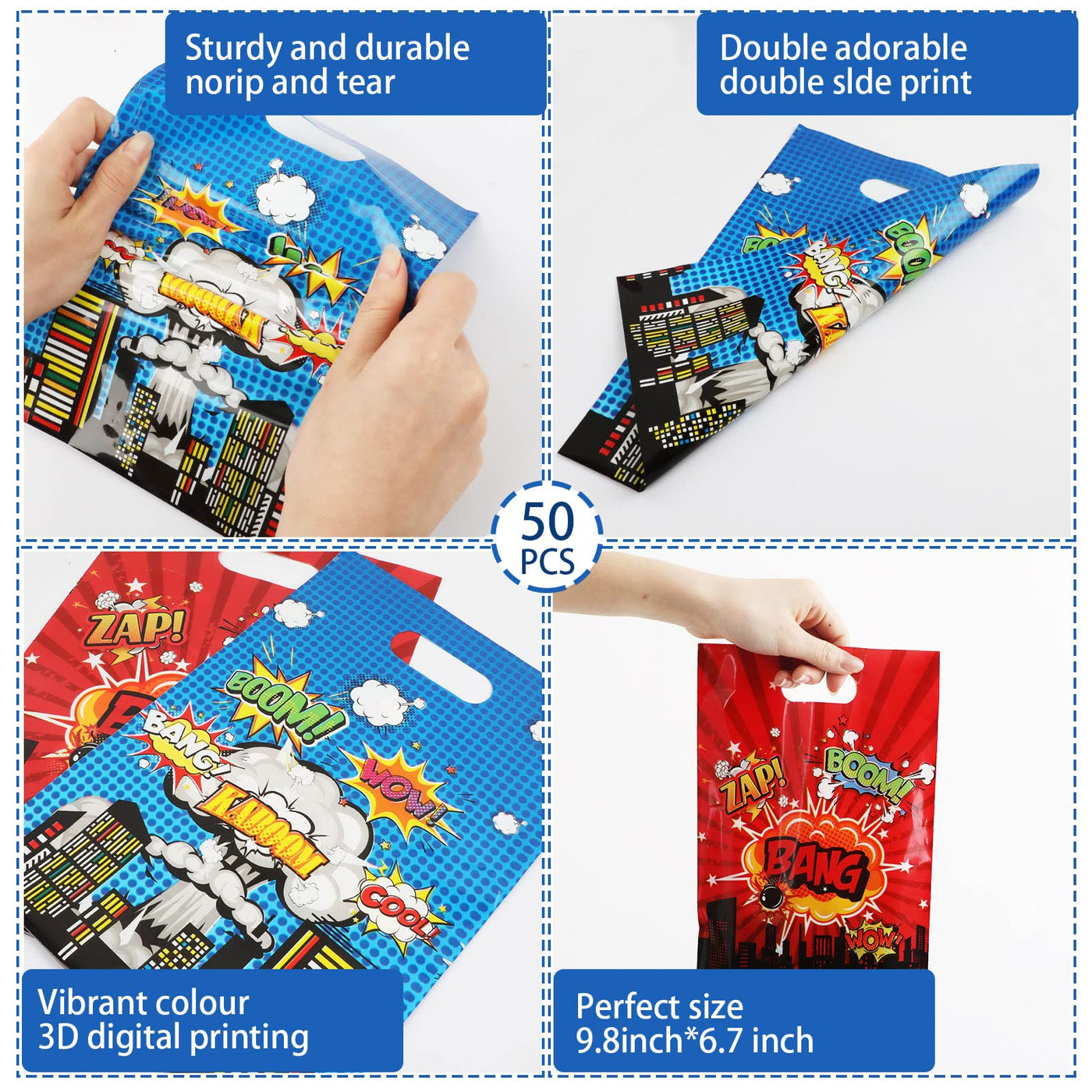 50 PCS Super Theme Hero Party Favor Bags Hero Happy Birthday Goodie Bags Hero Action Sign Candy Treat Bags Durable Plastic Hero Gift Bag for Baby Shower Boys Girls Birthday Party Decorations Supplies