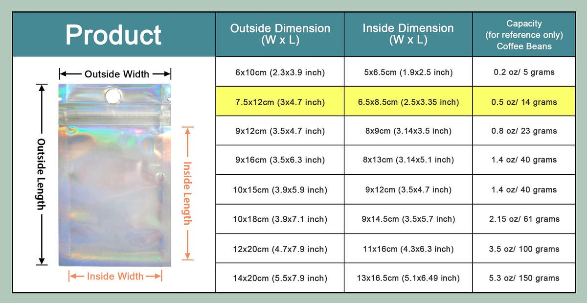 - Q: What are the dimensions of the bags? A: The bags come in various dimensions, including 7.5x12 centimeters (3x4.7 inches), 6x10 centimeters (2.3x3.9 inches), and several others up to 14x20 centimeters (5.5x7.9 inches).