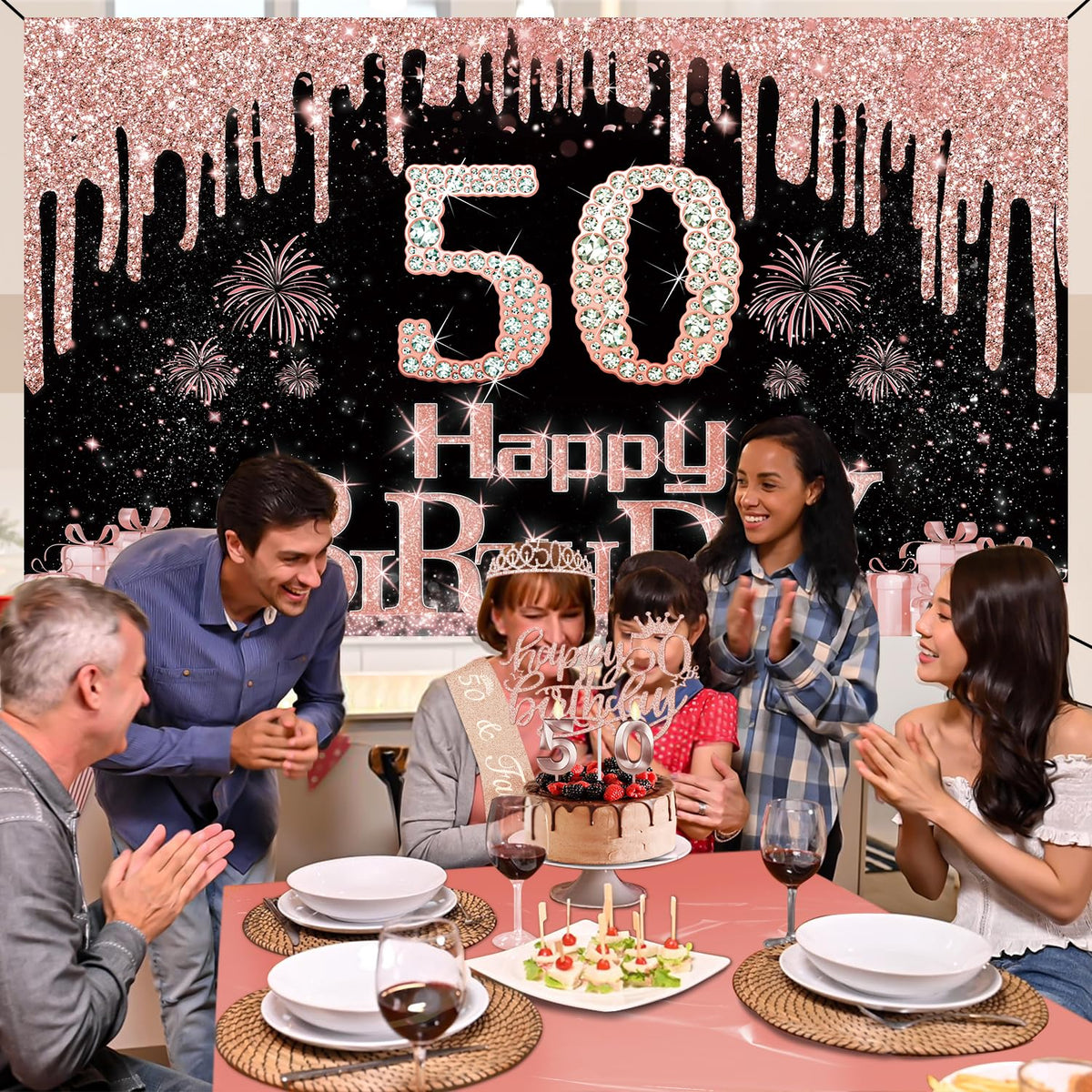 • Q: What items are included in the 50th Birthday Decorations pack? A: The pack includes a 50th Birthday Banner, Tiara, Sash, Happy 50th Birthday Cake Topper, Birthday Candles, Balloons, and a Rose Gold Tablecloth.