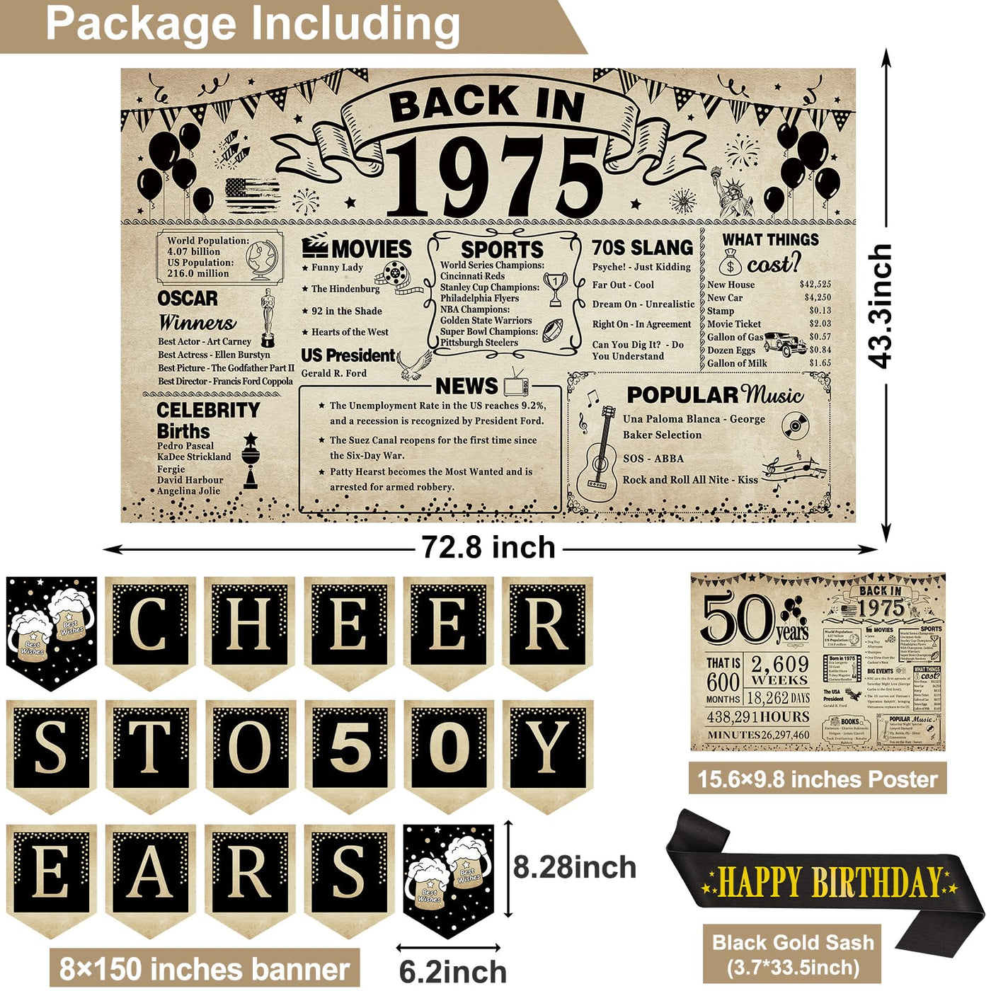 - Q: What items are included in the 50th Birthday Decorations kit? A: The kit includes 1 Back in 1975 Banner Backdrop, 1 Poster Anniversary Card, 1 Cheers to 50 Years Banner, 7 Hanging Swirls, 6 Paper Pom Poms, 6 Honeycomb Table Toppers, 1 Happy Birthday Sash, and 50 Number Balloons.