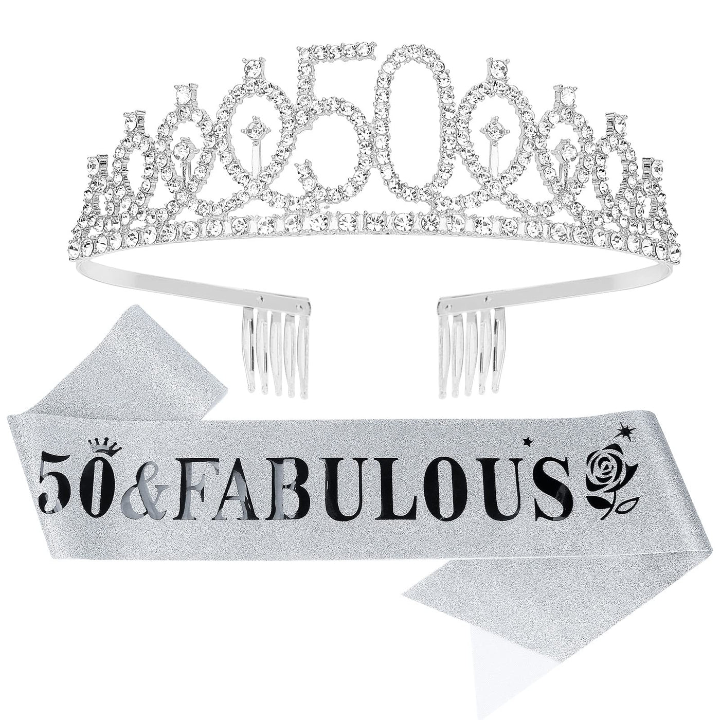 • Q: What is included in the 50th Birthday Sash and Tiara set? A: The set includes a '50 & FABULOUS' silver birthday sash and a silver rhinestone tiara.
