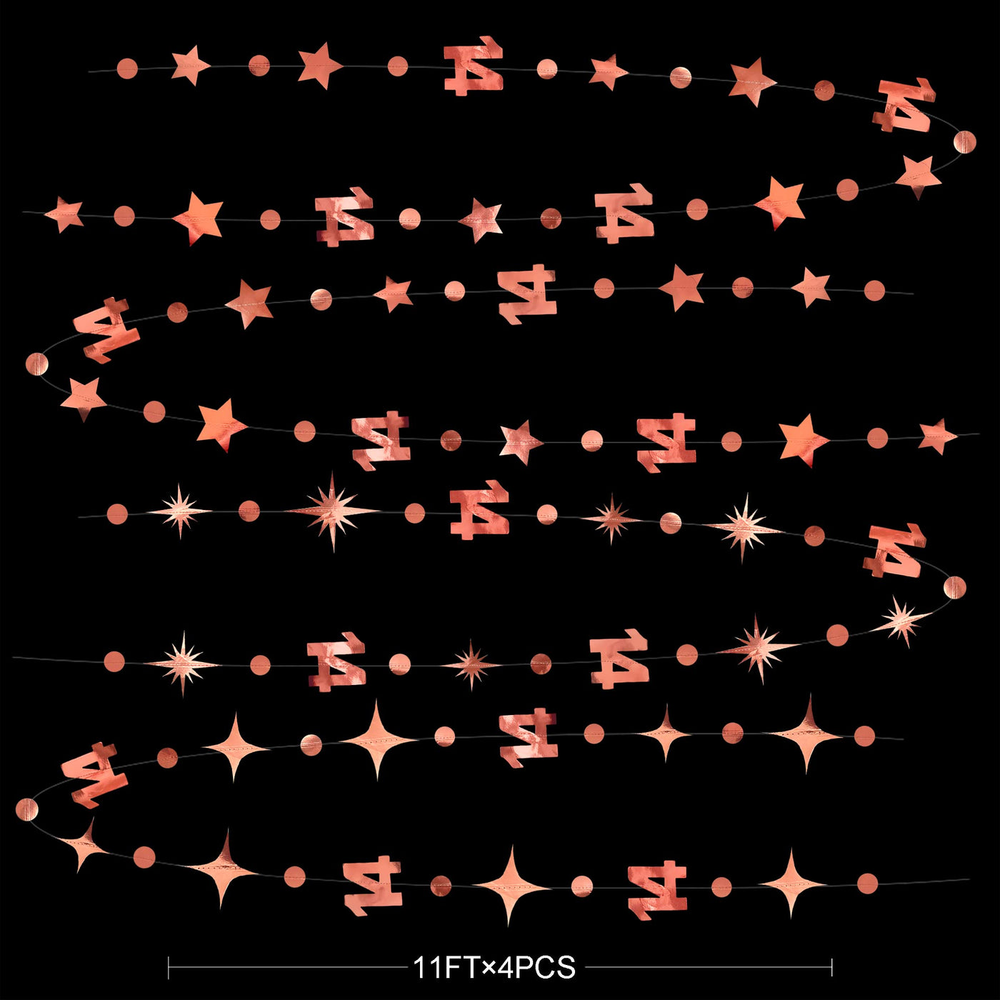 • Q: What is included in the Rose Gold 14th Birthday Decorations Kit? A: The kit includes 4 pieces of metallic star and circle dot garlands featuring the number 14, with a total length of 52 feet.