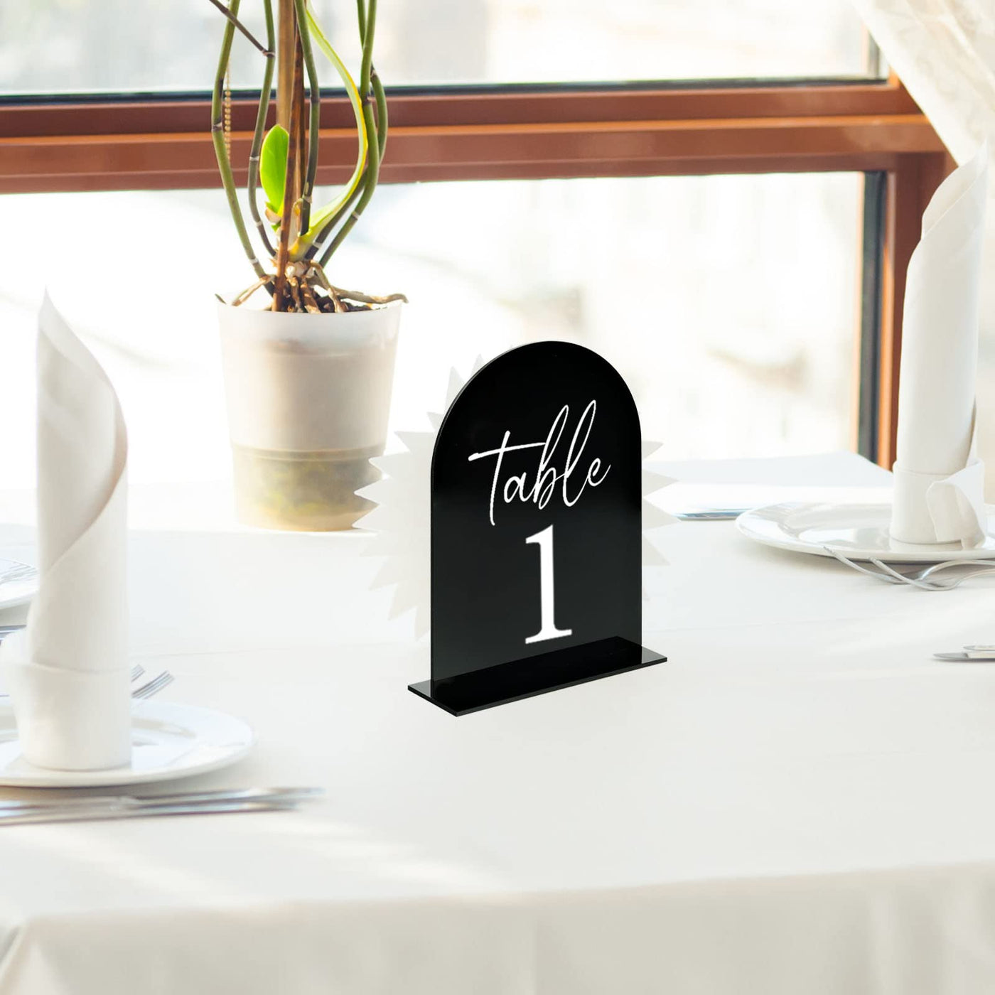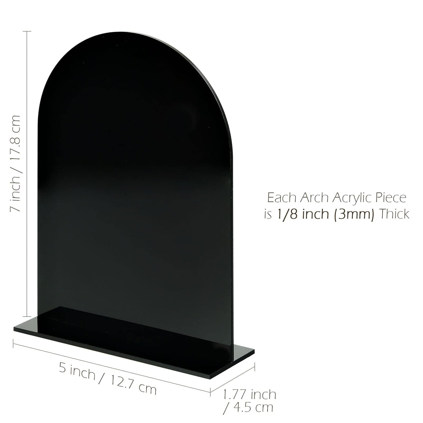 • Q: What is included in the JINMURY Black Arch Acrylic Sign package? A: The package includes 10 pieces of 5 by 7 inch black arch acrylic signs along with clear acrylic stands.