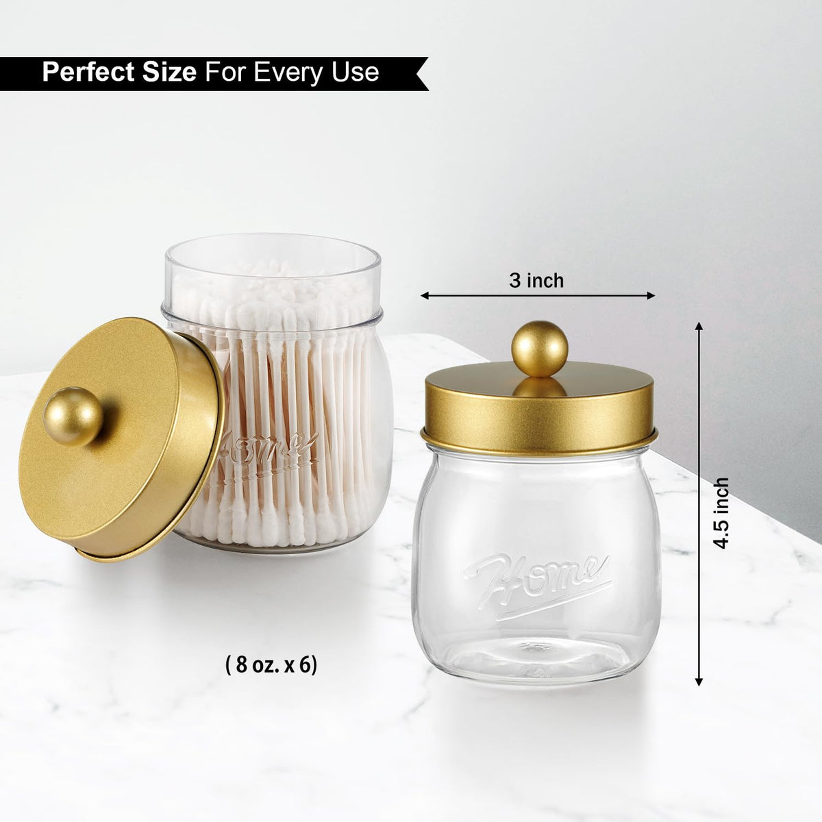 - Q: What is the size of each jar in the set? A: Each jar in the set is 8 ounces, making them perfect for organizing smaller items like cotton swabs, cotton balls, and hair ties.