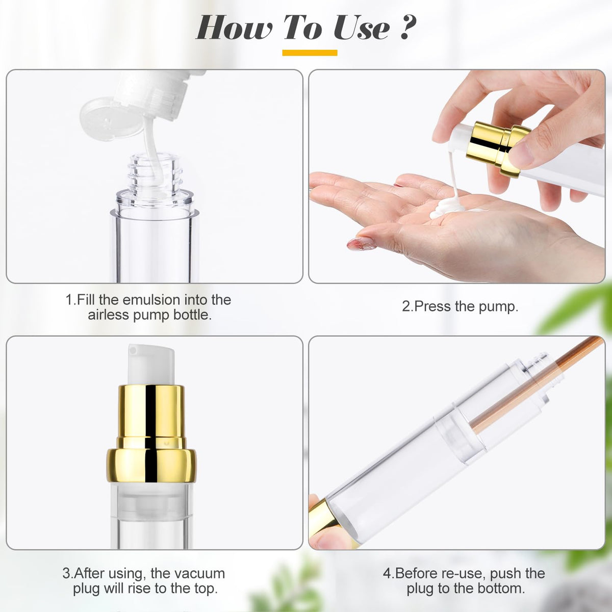 - Q: How do I refill the airless pump bottles? A: To refill, simply press down on the pump to remove the vacuum plug, fill with your chosen product, and then press the pump to return the plug to its original position.