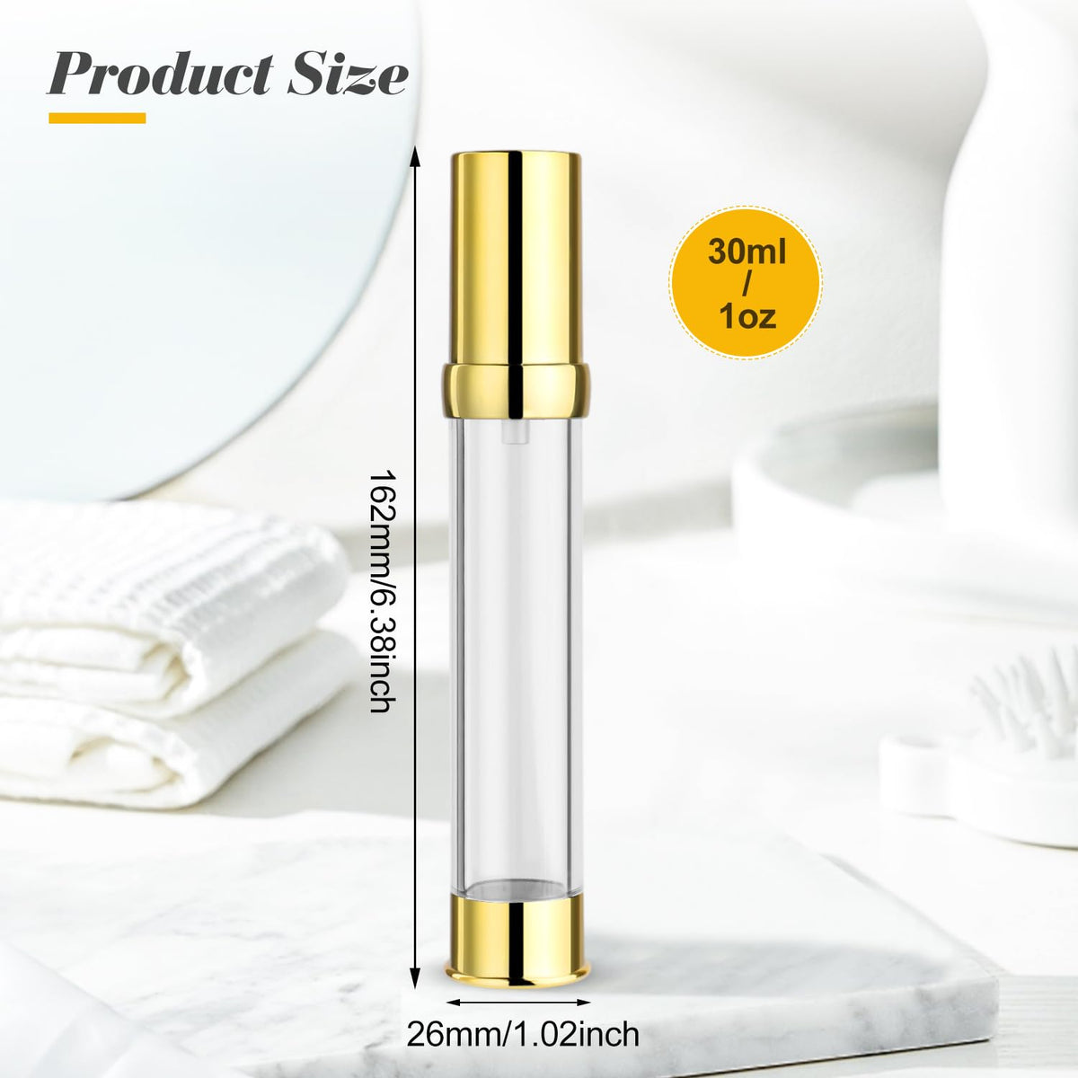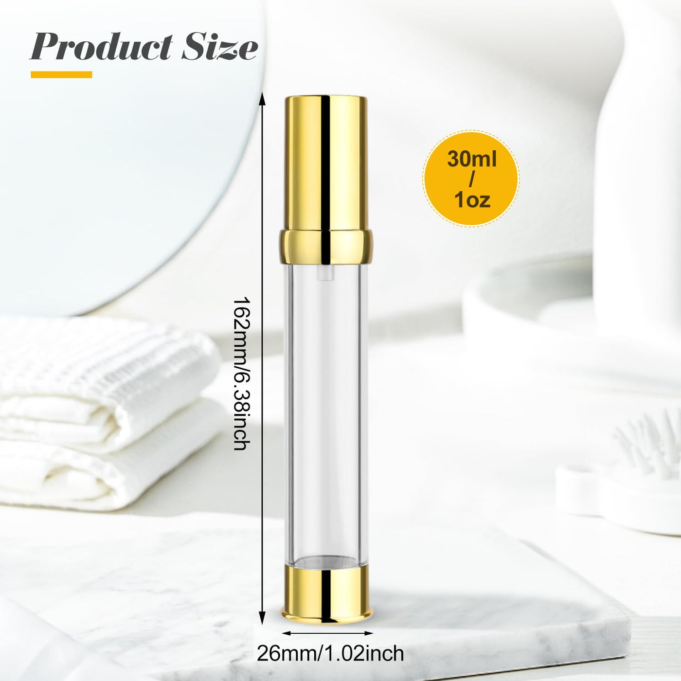 - Q: What is the capacity of each airless pump bottle? A: Each bottle has a capacity of either 30ml (1oz) or 15ml (0.5oz), making them suitable for various cosmetic products.