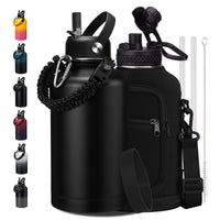 64 oz Insulated Water Bottle with Straw & Auto Spout Lids Paracord Handle Half Gallon Waterbottle Strap Carrier & Protective Boot Wide Mouth Metal Canteen Thermo Mug Leak-proof Sports Hydro Jug