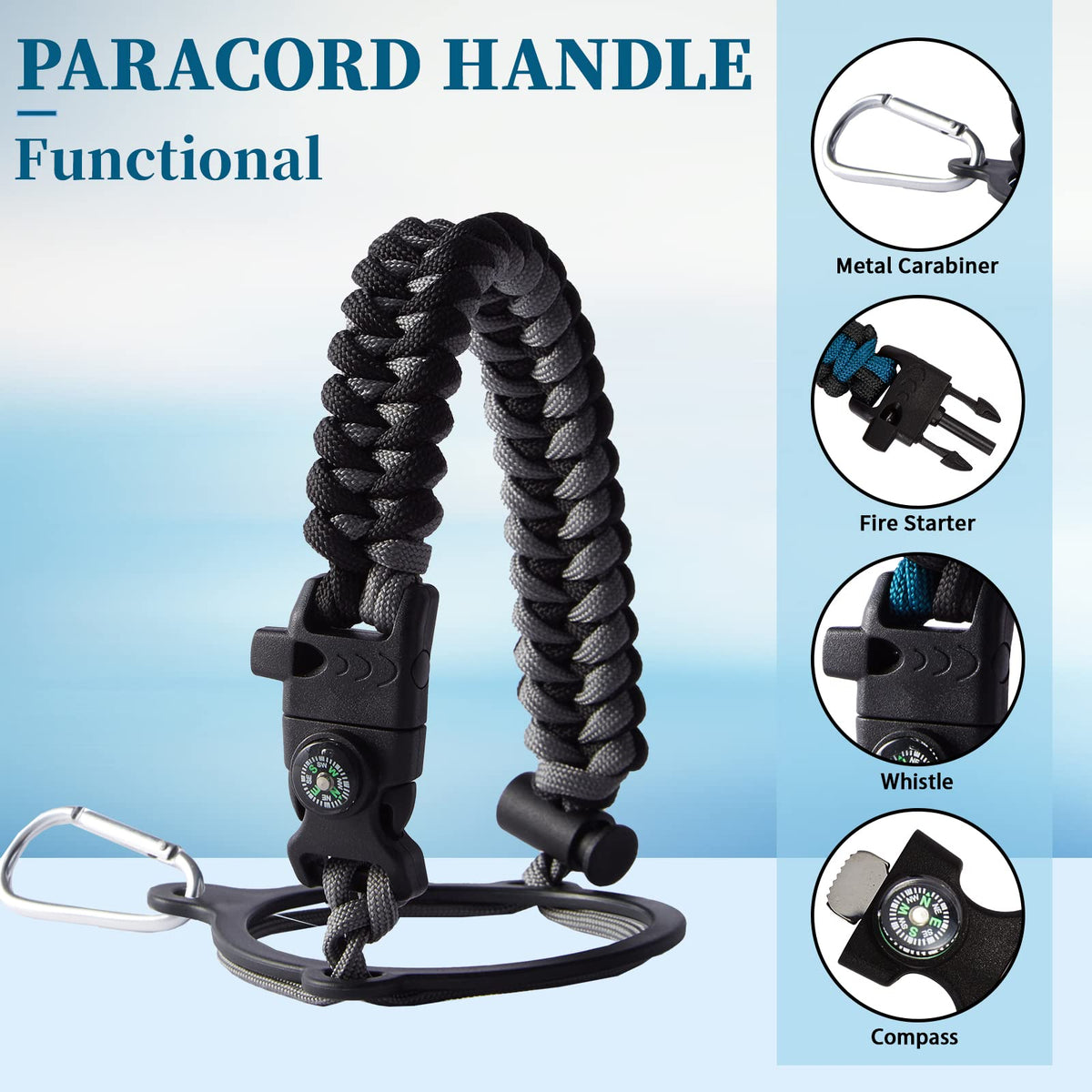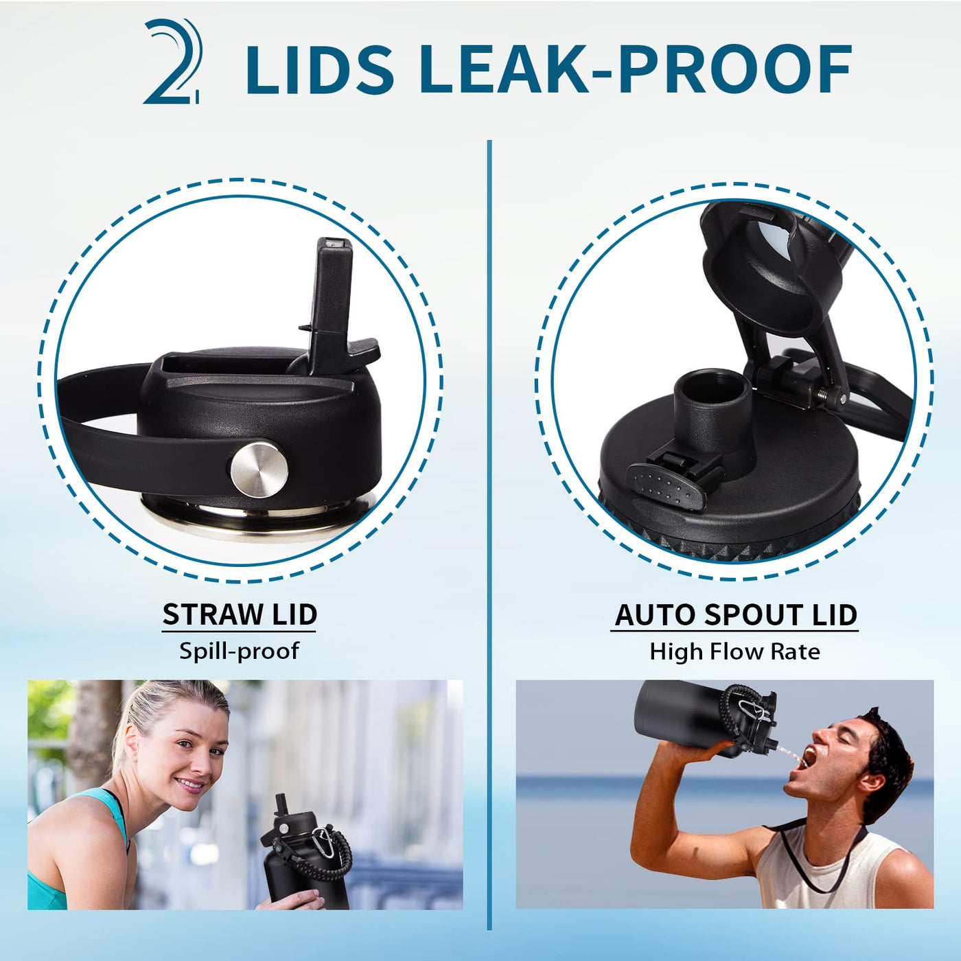 - Q: What accessories come with the water bottle? A: The package includes an auto spout lid, straw lid, paracord handle, a water bottle carrier bag, a shoulder strap, a silicone bottom boot, a straw brush, and two BPA-free straws.