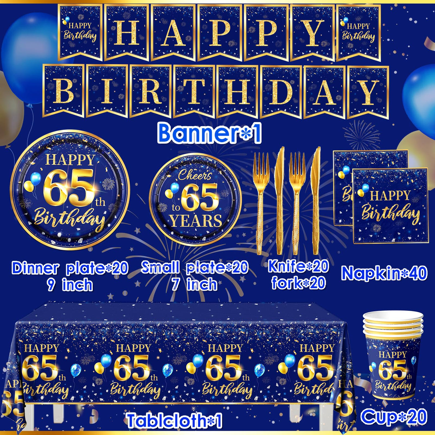 - Q: What does the 65th Birthday Decoration Men-142pcs set include? A: The set includes 20 plates, 20 dessert plates, 20 cups, 20 utensils (knives and forks), 40 napkins, a plastic tablecloth, and a happy 65th birthday banner.