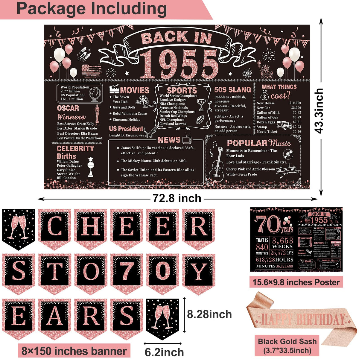 • Q: What items are included in the 70th Birthday Decorations set? A: The set includes a 'Back in 1955' banner backdrop, a poster anniversary card, a 'Cheers to 70 Years' banner, 7 hanging swirls, 6 paper pom poms, 6 honeycomb table toppers, a 'Happy Birthday' sash, and 70 number balloons.