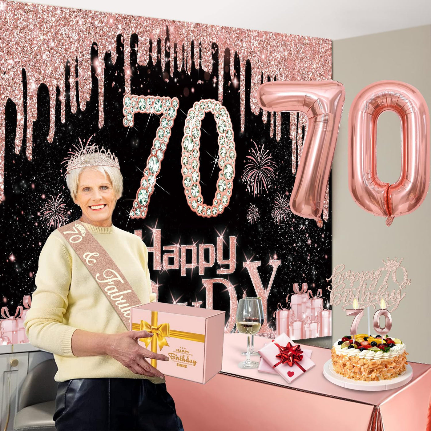70Th Birthday Decorations For Women With Banner, Rose Gold Tablecloth, Number Balloons, 70Th Birthday Sash And Tiara, Cake Toppe