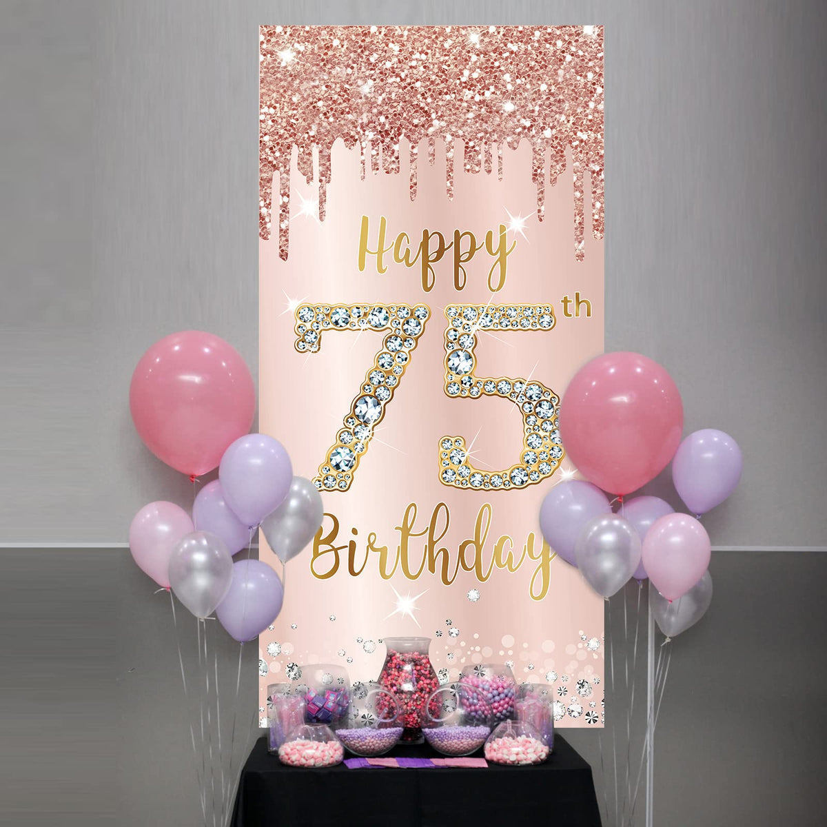 75Th Birthday Decorations Door Banner For Women, Pink Rose Gold Happy 75 Birthday Backdrop Party Supplies, 75 Year Old Birthday