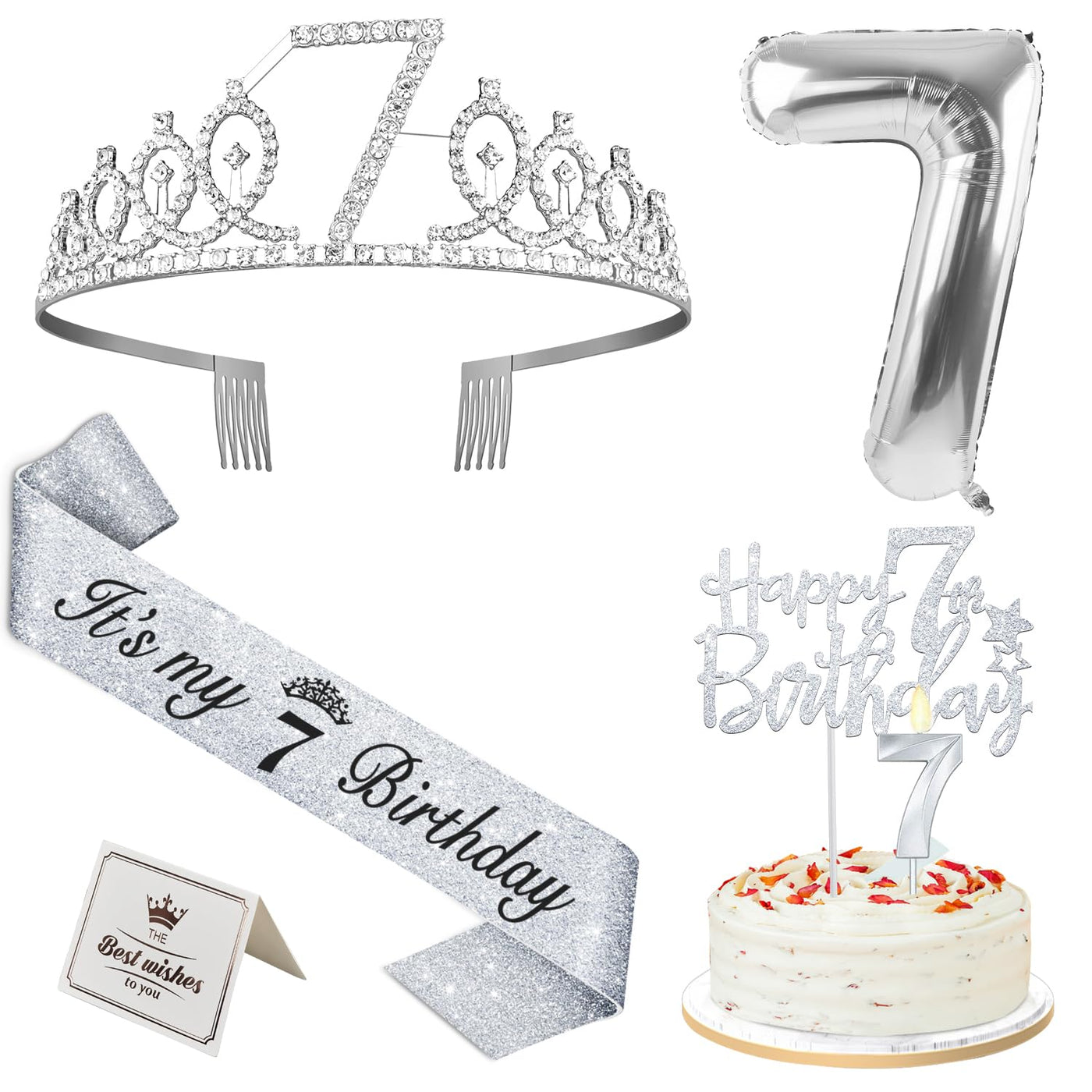 7th Birthday Decorations for Girls Silver with 7th Birthday Sash and Tiara, Cake Topper and Candle, Silver Number Balloon, 7 Yea