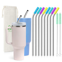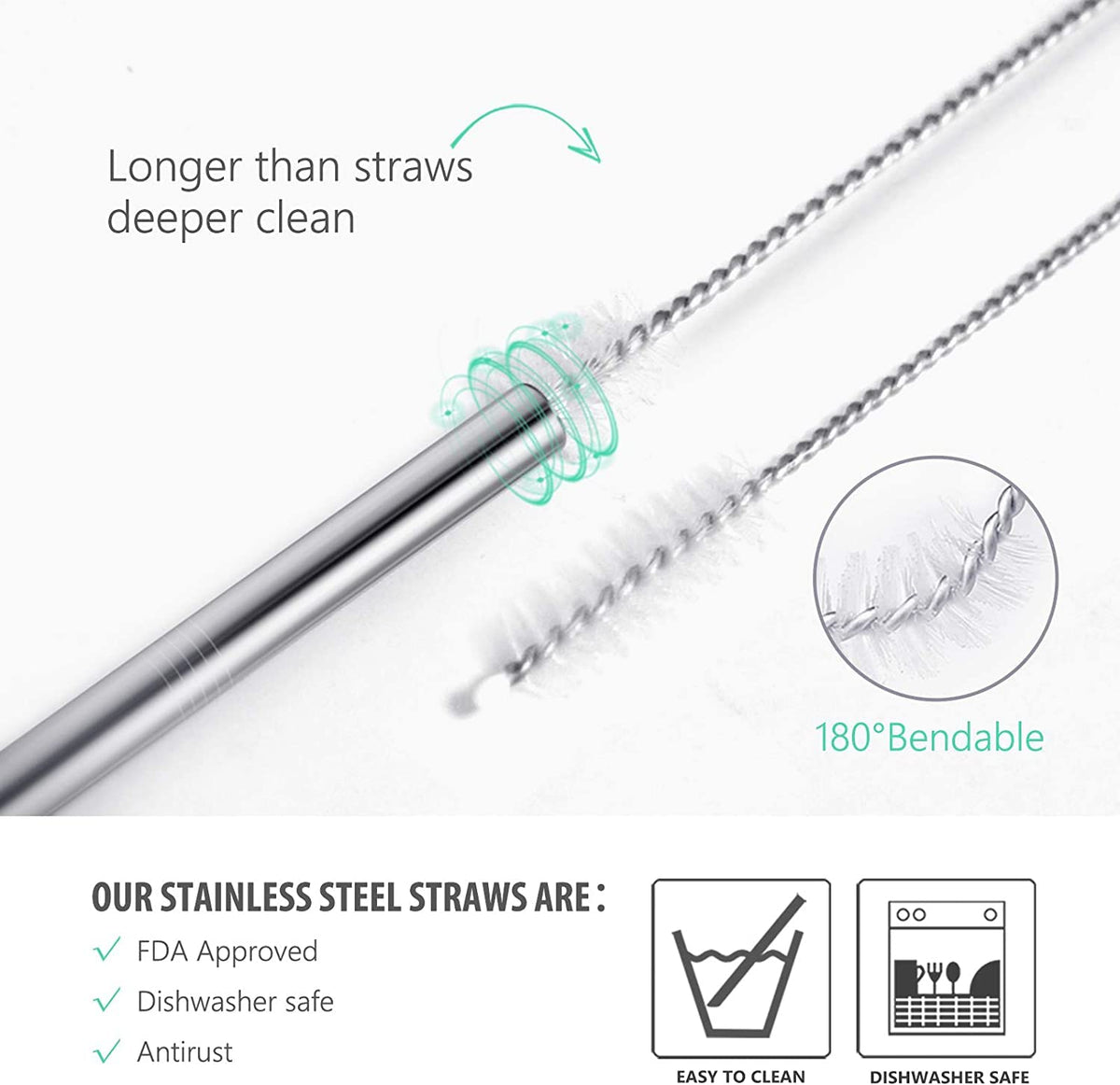 • Q: What is included in the set? A: The set includes 8 reusable stainless steel straws, 8 silicone tips, 2 cleaning brushes, and a carry bag.