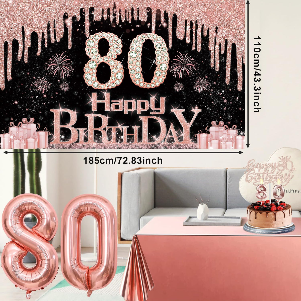 - Q: What items are included in the 80th Birthday Decorations pack? A: The pack includes a Happy 80th Birthday Banner, a Tiara, a Sash, a Cake Topper, Birthday Candles, Number Balloons, and a Rose Gold Tablecloth.