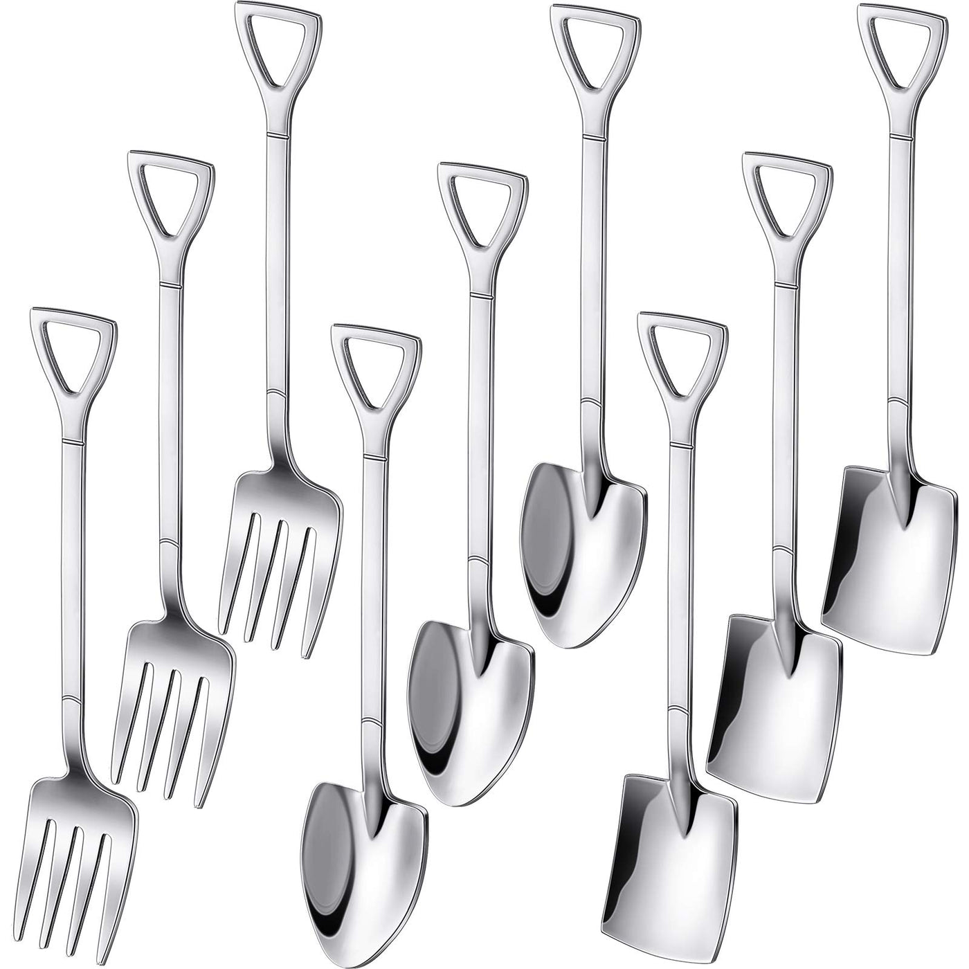 - Q: How many pieces are included in the set? A: The set includes a total of 9 pieces: 3 pointed spoons, 3 shovel shape spoons, and 3 forks.