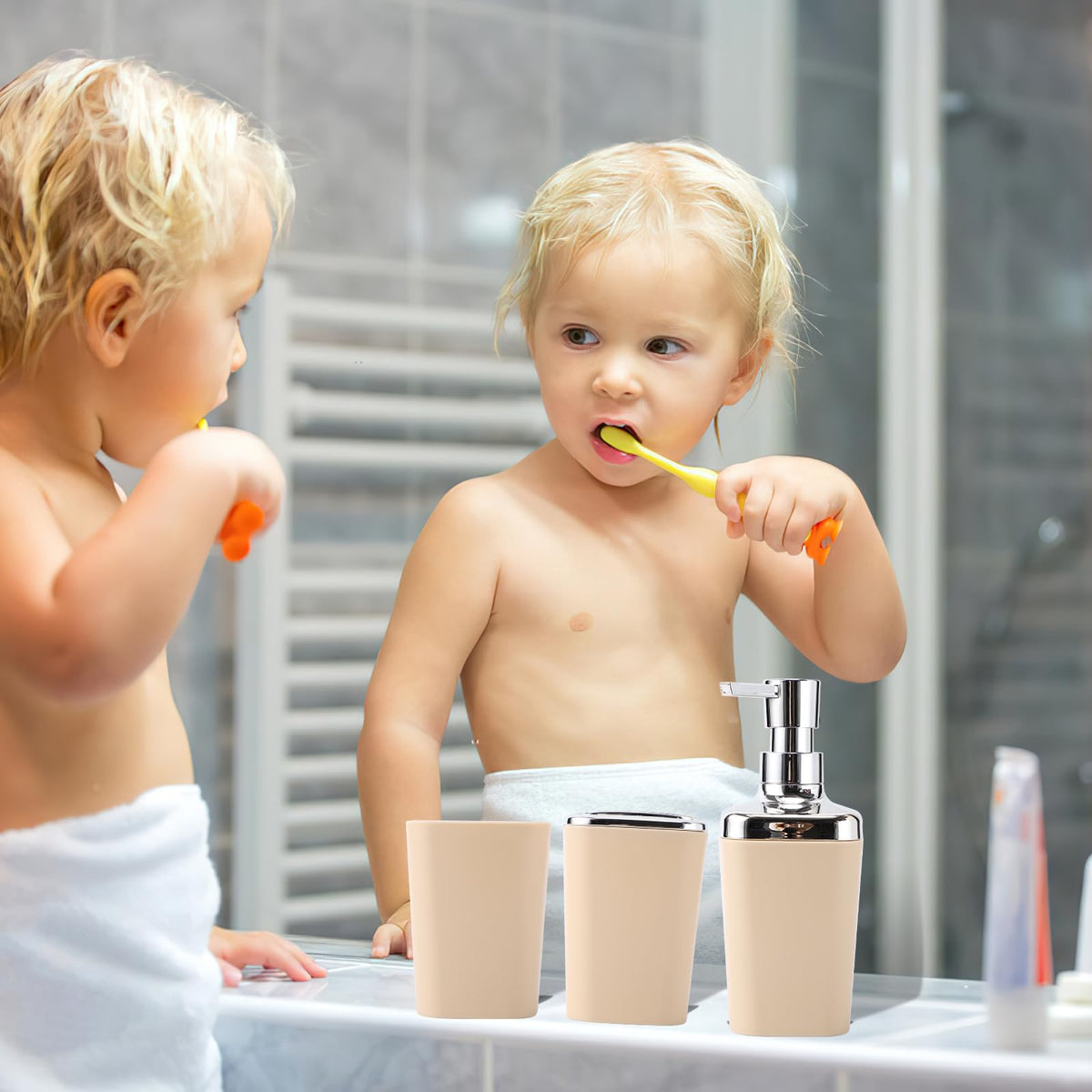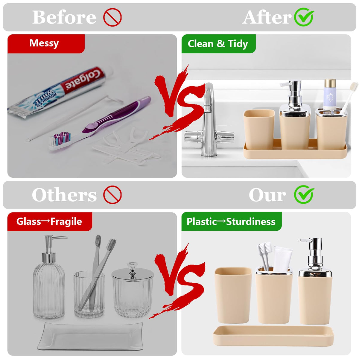 - Q: What is included in the XLHOMO Beige Bathroom Set? A: The XLHOMO Beige Bathroom Set includes a tray, soap dish, trash can, soap dispenser, toothbrush cup, toothbrush holder, toilet brush with holder, and two Q-tip holders.