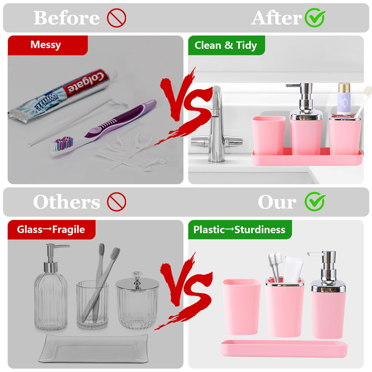 - Q: What is included in the 9-Piece Pink Bathroom Accessory Set? A: The set includes a tray, soap dish, trash can, soap dispenser, toothbrush cup, toothbrush holder, toilet brush and holder, and two Q-tip holders.