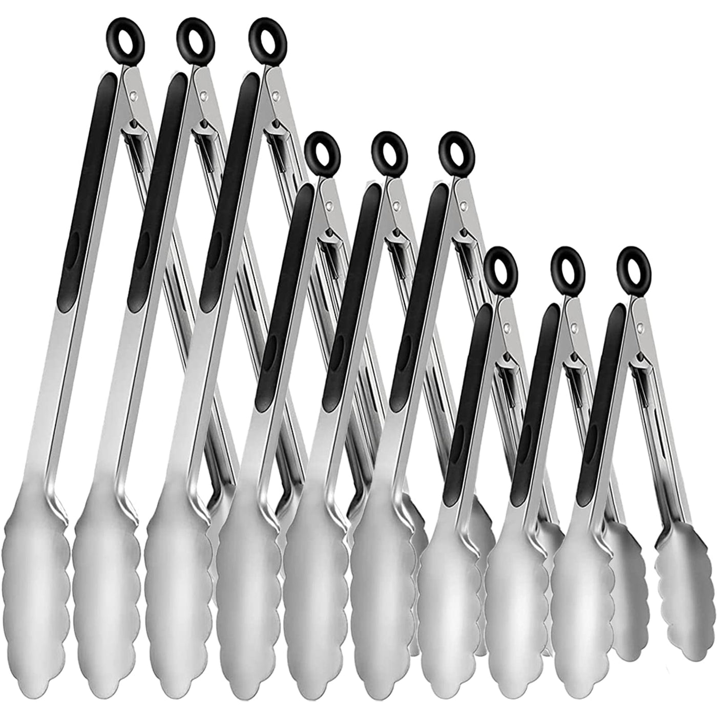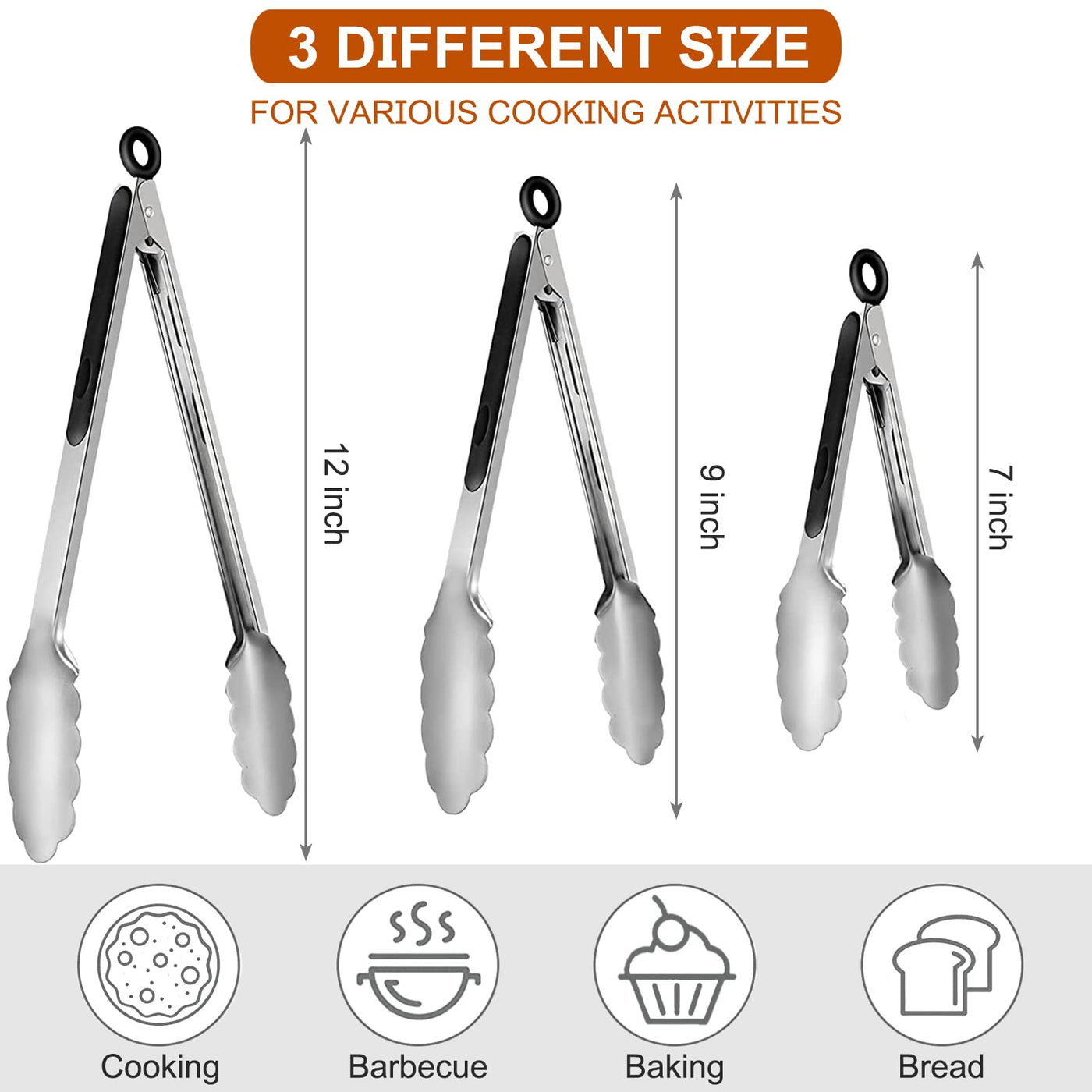 - Q: What are the sizes of the kitchen tongs included in the set? A: The set includes three different sizes of kitchen tongs: 3 pieces of 7 inches, 3 pieces of 9 inches, and 3 pieces of 12 inches.