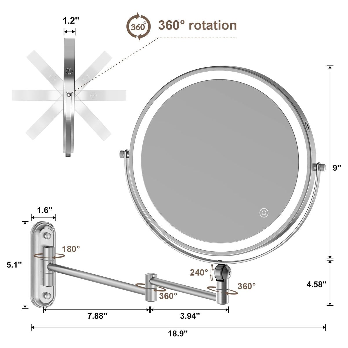 9'' Wall Mounted Makeup Lighted Mirror, 4000Mah Rechargeable Double Sided Led Vanity Mirror With Height Adjustable&1X/10X Magnif