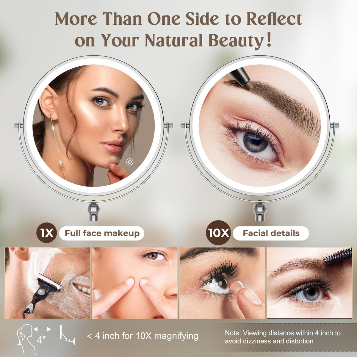 - Q: Does the mirror have adjustable magnification? A: Yes, the mirror features double-sided magnification with 1X and 10X options, allowing for detailed grooming and makeup application.