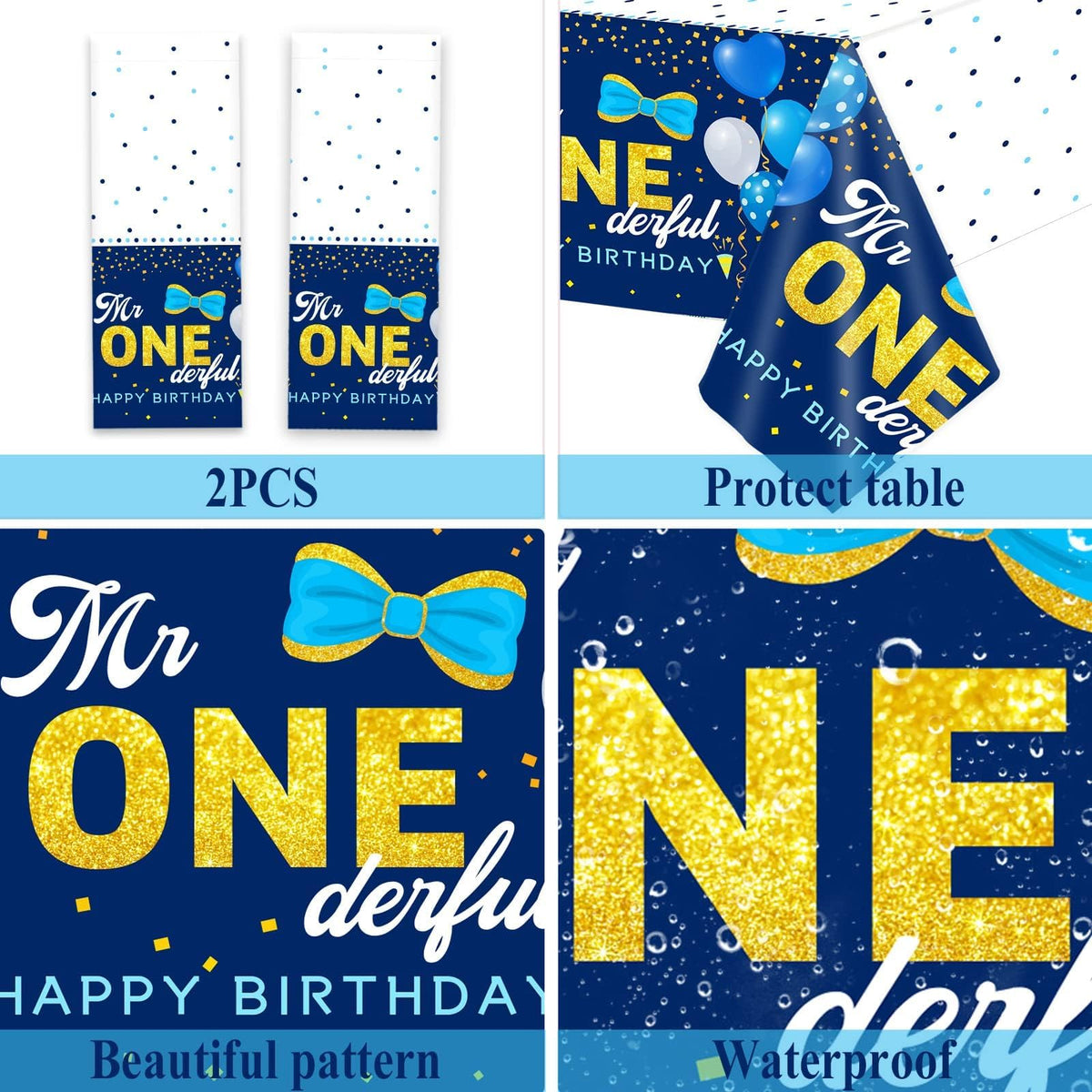 - Q: What items are included in the Mr Onederful 1st birthday party decorations set? A: The set includes 2 plastic tablecloths, 24 pieces of 9-inch dinner plates, 24 pieces of 7-inch dessert plates, 24 pieces of 6.5-inch napkins, and 24 plastic forks, serving up to 24 guests.