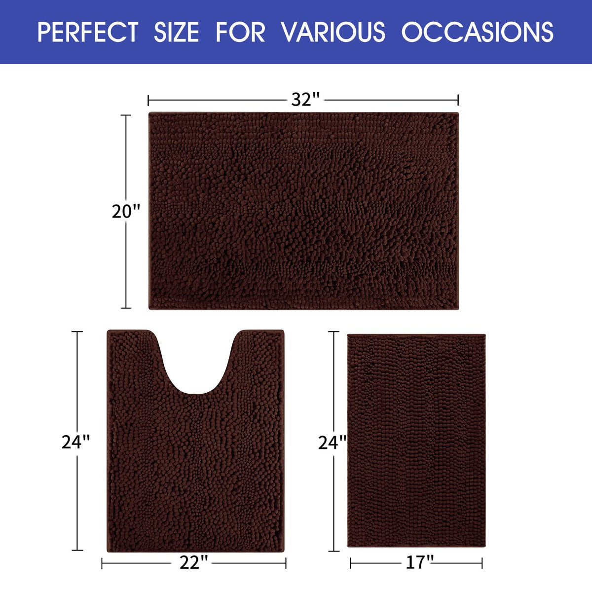- Q: How many pieces are included in the bathroom rug set? A: The bathroom rug set includes three pieces: a large bath rug (20"x32"), a small bath rug (17"x24"), and a U-shape contoured rug (22"x24").