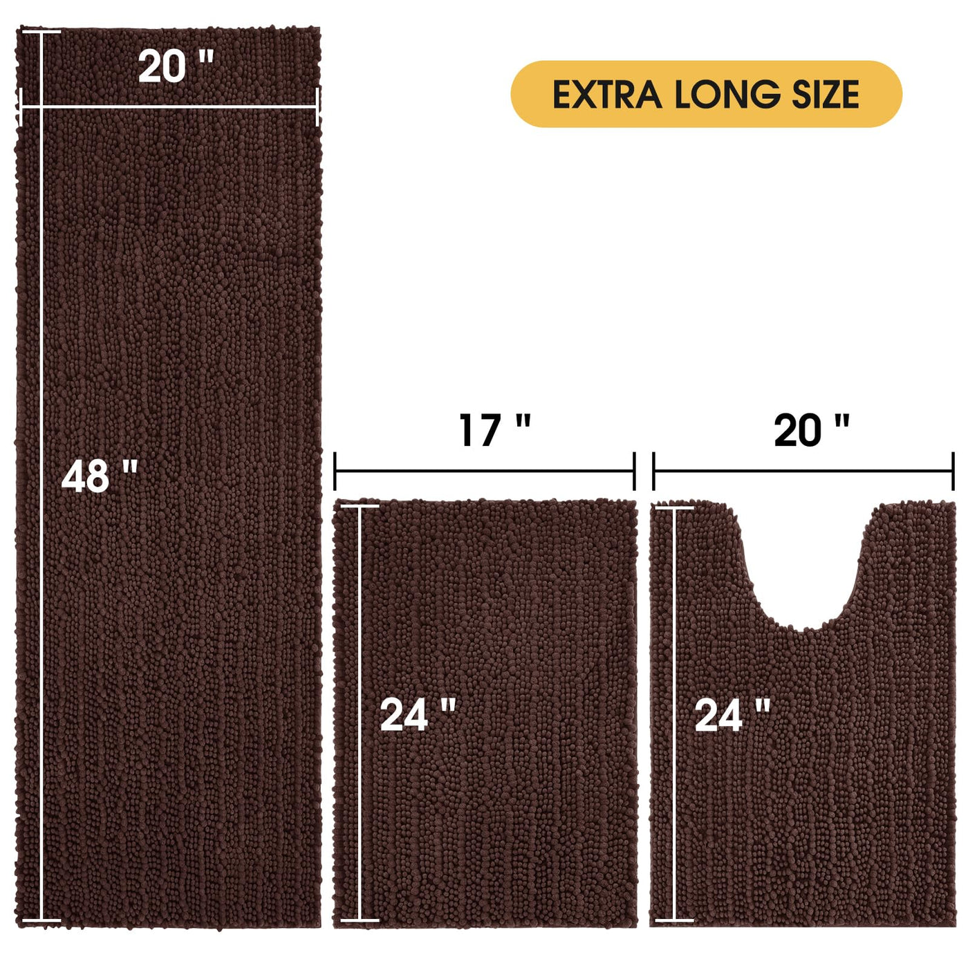 Accumtek Upgrade Extra Large Brown Bathroom Rug Set 3 Pieces Ultra Soft, Thick Absorbent Bath Mats, Non Slip Chenille Toilet Mat